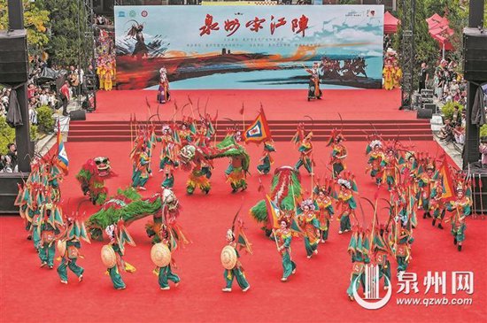 5月1日上午,泉州府文庙广场和中山路热闹非凡,时隔40余年,泉州古城再现“宋江阵”,108位“簪花大侠”带给市民游客独属于世遗之城泉州的惊喜。(融媒体记者陈英杰 摄) “五一”假期首日,极具特色的“国宝级”民俗艺术——泉州宋江阵,在千年古城精彩武动,开启非遗游园会。 龙虎旗挥舞开道,手持刀枪棍棒,随着鼓点交击,不断变换步伐……108名头戴簪花的“水浒英雄豪杰”亮相泉州府文庙广场。整场演出包括青狮表演、宋江阵传统民间特色艺阵表演、武术表演、高甲戏打斗杂耍等板块,呈现了两仪阵、田螺阵、长蛇阵、蜈蚣阵、蝴蝶阵、八卦阵等一系列精妙阵式,重现泉州“棍棒手扑,妙绝天下”的民俗风采,引得现场市民和游客连连鼓掌称赞。 宋江阵又称“套宋江”,是一种源于民间的武术操,流行于泉州各地,至今已有数百年历史。据记载,当时支持郑成功反清复明的义士,为避清廷打压,将武术套路融入迎神赛会,从而诞生了以装扮108位水浒英雄进行踩街的“宋江阵”。宋江阵展演不仅体现了泉州作为闽南文化祖地的渊源及地位,彰显尚武崇德、爱国爱乡、爱拼敢赢的中华传统美德,更充分展现泉州深厚的文化底蕴和敢为天下先的开拓进取精神。 此次非遗游园会,是泉州古城时隔40余年后,首次大规模复原宋江阵展演场景。除当天在府文庙、中山路踩街巡游,“五一”假日期间,宋江阵还将走进东海金花广场、晋江九十九溪田园风光景区、南安九日山等地展演。(融媒体记者陈林森 王宇静 视频张凌波 洪荣堆) |
