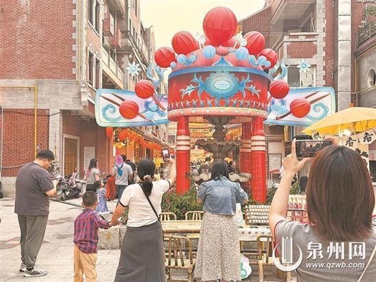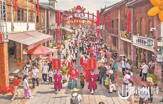 游客在状元街打卡“状元帽” 这个“五一”假期,泉州围绕本土深厚的状元、非遗等元素举办了丰富多彩的人文活动,以“状元”为媒,彰显“海滨邹鲁”的独特文化魅力。精彩的活动吸引了一波波打卡热,众多市民游客纷纷体验、分享这座“宝藏城市”。 古今交融 再现“状元巡游”盛景 5月1日下午2时许,备受市民游客期待的状元巡游演出在永春五里古街拉开帷幕。鸣锣开道,扮演“状元”的演员身着红袍走在队伍的最前方,带领白鹤拳师、舞狮队、女子鼓队沿古街而行,再现状元游街春风得意之景。 巡游队伍途经魁星阁,“状元”登阁举行魁星祈礼仪式,扮演“魁星”的演员头戴面具,精彩演绎了“魁星点斗”绝技,引来观众阵阵叫好。来到互动点位时,“状元”停下来与游客进行民俗问答、对诗词、踱方步等互动,并向孩子们赠送状元笔。许多带小孩的游客兴致高昂地参与互动,还排起长队等候与“状元”“魁星”合影。 据了解,这个“五一”假期,状元巡游演出将于每天下午2时在五里古街和市民游客见面。“巡游演出给人一种‘古今交融’的感觉,既可以沉浸式体验本地文化,又能讨一个好兆头,特别适合带娃来参加。”拿着做游戏获得的状元笔,来自广东的彭女士高兴地说,这次全家来泉州旅游,特意安排了一天来永春,除了看“状元巡游”外,晚上还准备品尝富有永春特色的“魁星宴”。