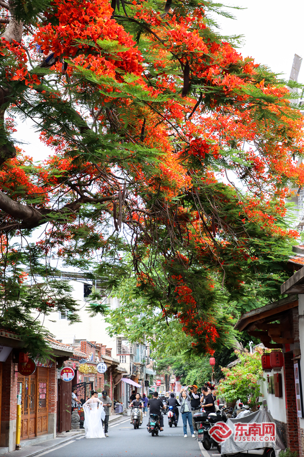 不少市民游客在盛开的凤凰花下拍照。东南网记者 林婕 摄