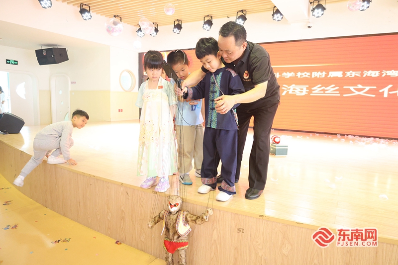 “今年儿童节恰逢端午,为更好地传承传统文化,增强孩子们对传统节日的参与感,我们鼓励大家身着汉服、唐装等传统服饰,厚植文化自信。”负责小班教学的老师李欣颖介绍,“海丝文化节”作为幼儿园的品牌项目,每年都会根据师生建议优化升级。今年在保留糖画制作、四果汤品尝、香囊DIY等经典项目的基础上,新增茶文化体验区与古早豆花品尝区。非遗文化展演环节更是亮点十足,除了南音、提线木偶外,少林五祖拳、永春白鹤拳等武术表演也惊艳亮相,让孩子们近距离感受传统武术的刚柔之美。