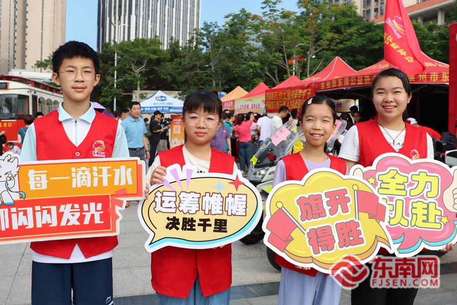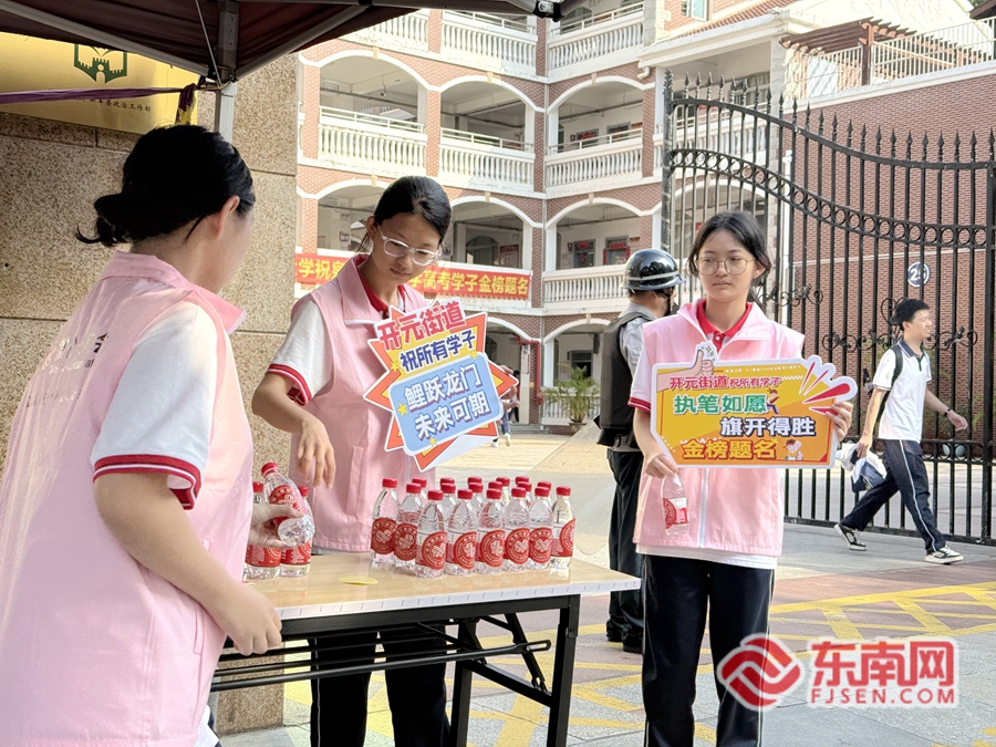 在泉州五中(城东校区)门口,小小志愿者们来为高考生加油助力。东南网记者 林婕 摄