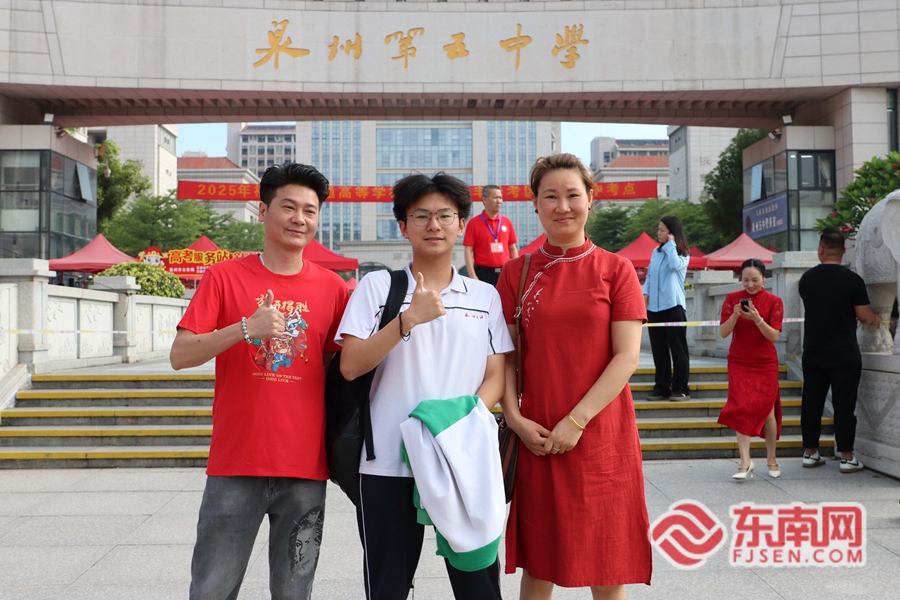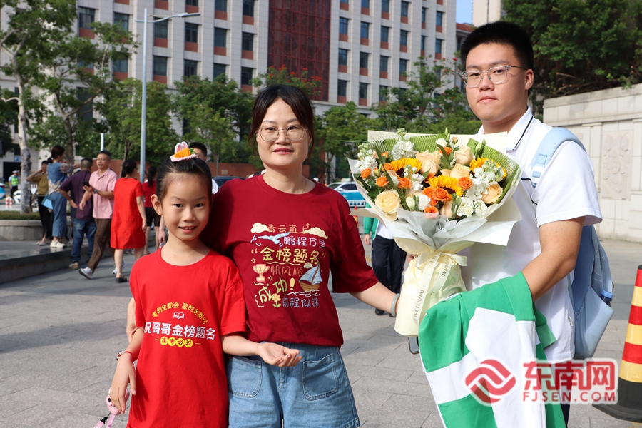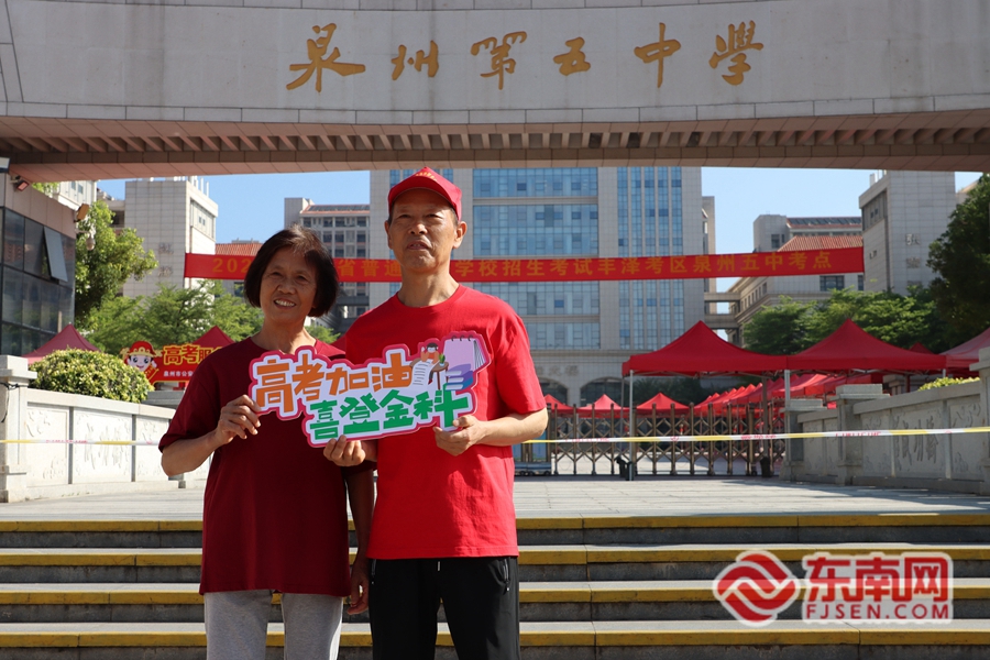 在泉州五中(城东校区)门口,考生妈妈和妹妹身穿“金榜题名”。东南网记者 林婕 摄