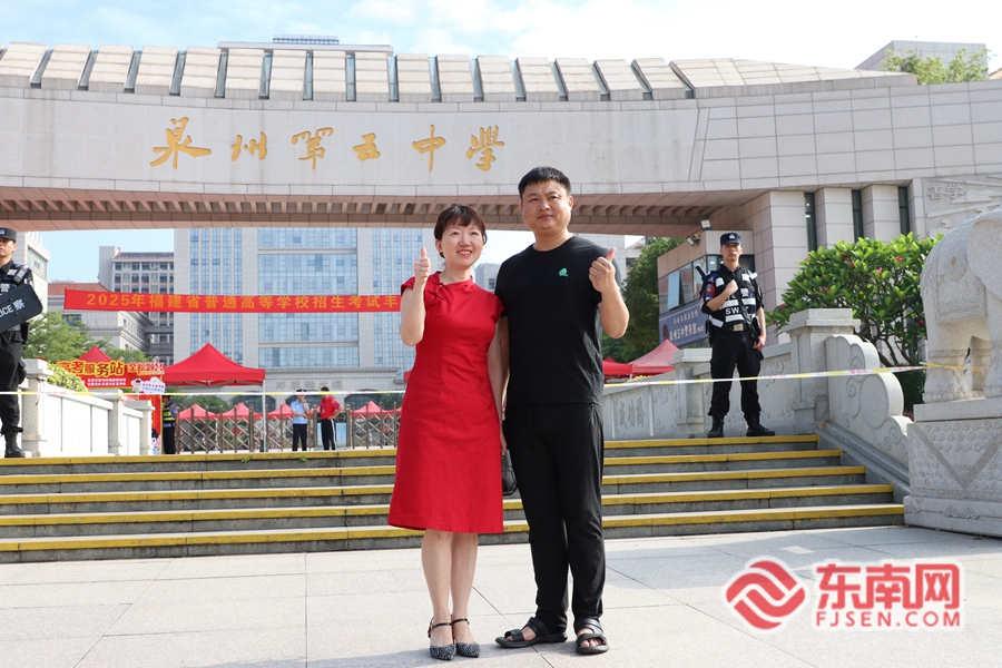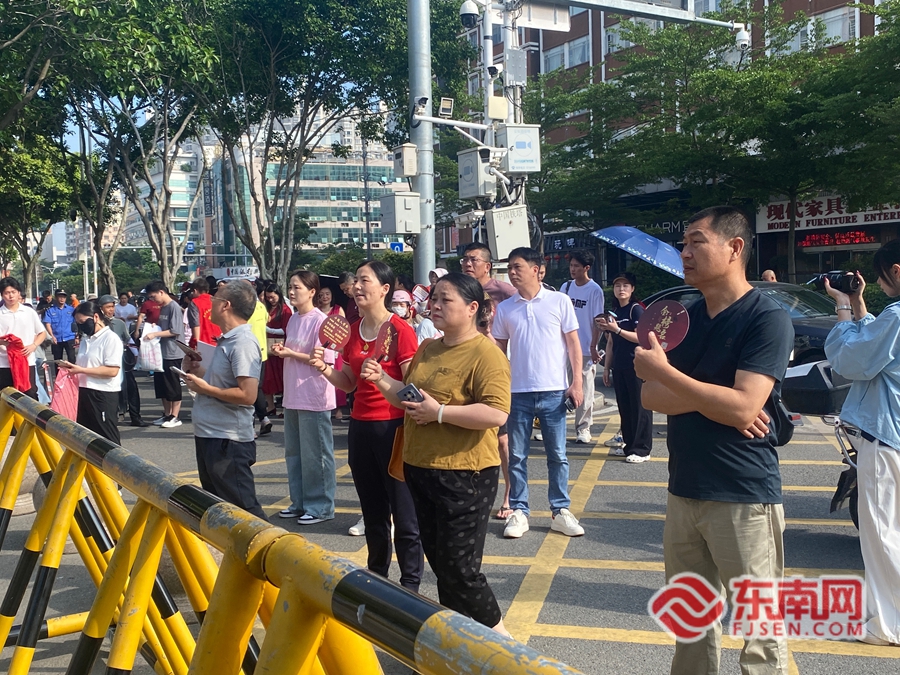 在泉州五中(城东校区)门口,家长身穿红衣为考生加油。东南网记者 林婕 摄