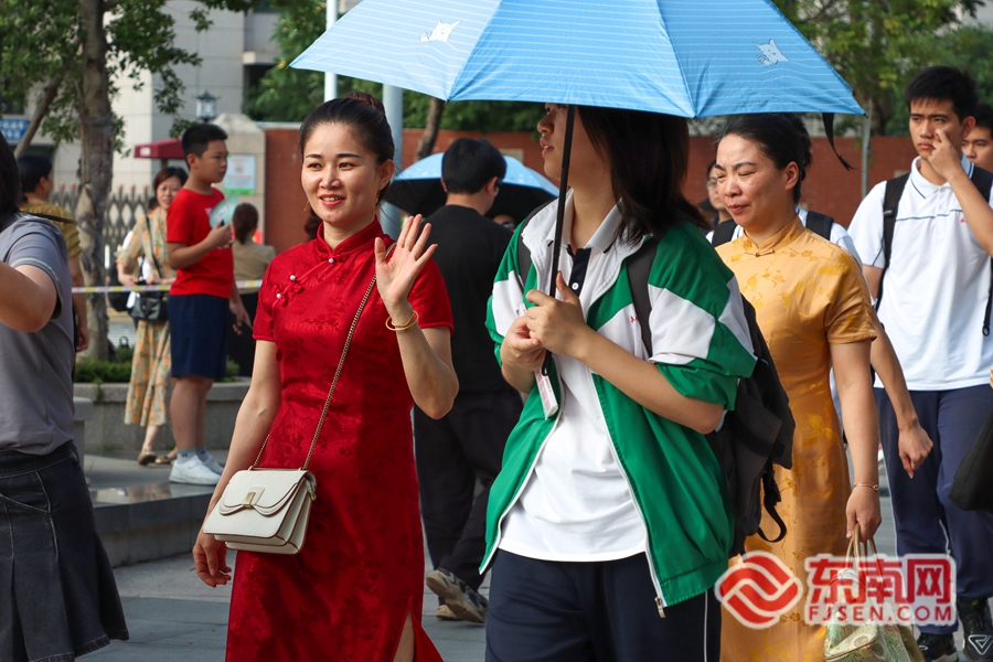 在泉州五中(城东校区)门口,家长身穿旗袍送考生,寓意旗开得胜。东南网记者 林婕 摄