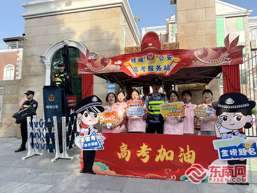 在泉州培元中学门口,志愿者们与民警一起为高考考生加油。东南网记者 施远圻 摄