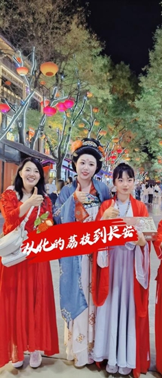 现场签约仪式 文化交融:古今丝路荔枝情 活动的文化体验从会客厅延伸至西安地标大唐不夜城。夜幕降临,荔枝化身为文化信使,在盛唐气象与现代繁华间架起桥梁。开元广场上,身着华美“凤凰衔绶”汉服的“唐美人”驿使,向游人递送装有岭南鲜甜荔枝与温泉体验券的精美礼盒,传递穿越时空的情谊。贞观之治雕塑群前,“穿汉服·品从化鲜荔”的互动邀约吸引众多游客驻足参与。汉服店内的荔枝纹饰拓印体验区人头攒动,参与者亲手拓印荔枝图案,换取鲜果或丝绸书签,岭南风物之美在互动中悄然浸润人心。