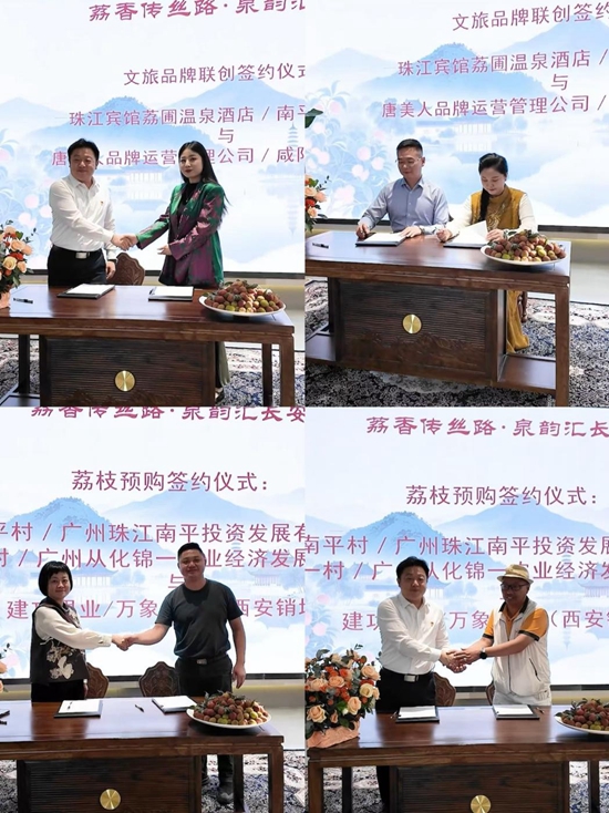 现场产品展台 6月7日,西安浐灞国际港丝路会客厅内果香弥漫,气氛热烈。精心打造的“凤凰衔绶”主题展台旁,新鲜采摘的荔枝静待来宾品鉴。从化区委宣传部有关负责人介绍了从化“北回归线上明珠”的生态魅力与荔枝产业特色。荔圃温泉酒店驻店总经理林海云则聚焦“温泉+荔枝”核心资源,深入阐述了其独特的康养价值与深厚的文化内涵。 签约落地:开启产业合作新通道 推介会现场迎来重要时刻。荔枝预购签约仪式上,南平村广州珠江南平投资发展有限公司、广州从化锦一农业经济发展有限公司与西安建功果业有限公司、西安万象果品有限公司现场签订了预购协议。这标志着从化荔枝规模化进军西北市场的战略通道正式打通。未来,来自南平村和锦一村的高品质荔枝,将依托建功果业和万象果品的成熟销售网络,快速进入西安市场,满足当地消费者对新鲜、优质荔枝的需求。 紧随其后的是文旅品牌联创签约仪式。珠江宾馆荔圃温泉酒店、南平静修小镇分别与唐美人品牌运营管理公司、咸阳国际旅行社签署了合作协议。珠江荔圃温泉酒店将与唐美人品牌携手,整合双方资源,共同开发并推广具有浓郁岭南风情的温泉康养旅游产品,旨在提升从化温泉品牌在西安的影响力,为西安游客带来全新康养体验。南平静修小镇则与咸阳国际旅行社达成战略合作,双方将联合设计开发连接从化与西安的特色文旅线路,深度融合从化的自然生态、温泉资源与西安厚重的历史文化底蕴,推出一系列吸引力十足的旅游产品,促进两地游客互访,为文旅产业注入新活力。