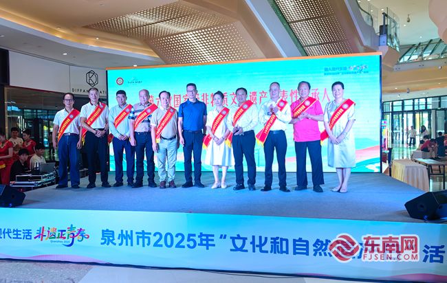 启动仪式现场。主办方 供图 启动仪式上,精彩的非遗展演率先登场。泉州刣狮展现出勇猛气势,提线木偶戏灵动有趣,南少林武术刚劲有力,非遗民俗展演《蟳埔·簪花》充满闽南风情,这些表演充分展示了泉州深厚的文化底蕴,瞬间点燃现场气氛。 活动现场,举行了《非遗泉州》宣传册授书、刺桐港非遗传承体验基地授牌、刺桐港非遗城与入驻商户签约等仪式,以及为第七批市级非遗代表性项目、第六批省级非遗代表性传承人、第六批国家级非遗代表性传承人颁授牌匾、证书与绶带。现场还同步进行文化遗产法律法规宣传。