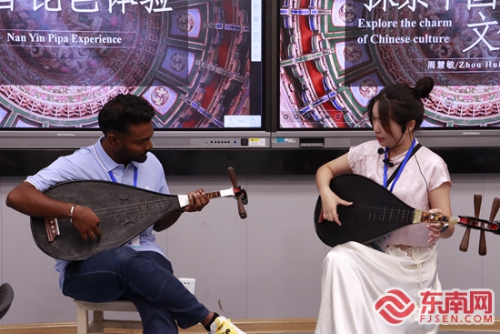 马来西亚学子学习琵琶。泉州经贸职业技术学院 供图 沉浸式感知中华魅力 友谊种子悄然萌芽 技能点满满的专业实训课让马来西亚学生们全神贯注,而有趣的中文学习与文化体验课,也激发起他们的探索欲,使课堂欢声笑语不断。 “为了让学生们在学习专业技能的同时,能沉浸式感受中华文化的魅力,我们特别将中文学习与舞龙、书法等文化体验课有机融入培训中。”该校人工智能学院副院长叶茂樟告诉记者,看到学生们在体验课上兴致勃勃地尝试,课堂气氛热烈活跃,这正是我们希望达到的效果——让技能学习与文化熏陶相得益彰,在年轻学子心中播下友谊与理解的种子。