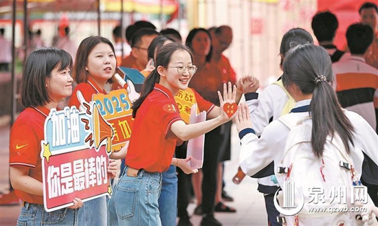 6月19日上午,泉州九中考点外,老师们手持“中考必胜”“加油吧,少年”手牌迎接考生,考生们开心地与老师击掌,从容走进考点。12.45万名泉州学子在这场大考中,不仅带着笔墨上阵,更携着用爱意酿造的“甜”奔赴未来——正如今年福建中考作文题《未来总是甜的》的启示:每一份真诚付出,终将沉淀为青春的甘甜。