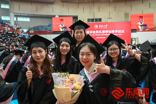 毕业生们在毕业典礼上身着学士服合影。盛潇婷 摄 华侨大学政治与公共管理学院2010届校友、福建省宁德市周宁县浦源镇党委书记、“全国脱贫攻坚先进个人”李丹舟作为校友代表发言。她结合自身在基层的工作经历,用四句话与学弟学妹们共勉:学会自我解嘲也是有勇气的表现;格局决定成就上限;不要“差不多”,盯住“最完美”;别怕多干活,你的每一份付出都将成为宝贵的财富。 中宣部国家级青年人才项目入选者、法学院教授刘超,教育部国家重大人才工程青年项目入选者、材料学院和发光材料与信息显示研究院副教授田成波分别作为教师代表发言。旅游学院斐济华侨学生马思曼、机电及自动化学院硕士生庞义澳,分别作为毕业生代表发言并领读毕业誓词。 典礼现场,华侨大学选拔、聘任216名同学为2025届校友联络员,并颁发聘书。值得一提的是,毕业生们还以鲜花为礼,向默默付出的宿舍管理员、食堂员工、保安、校医等学校管理服务一线职工代表致谢。 |