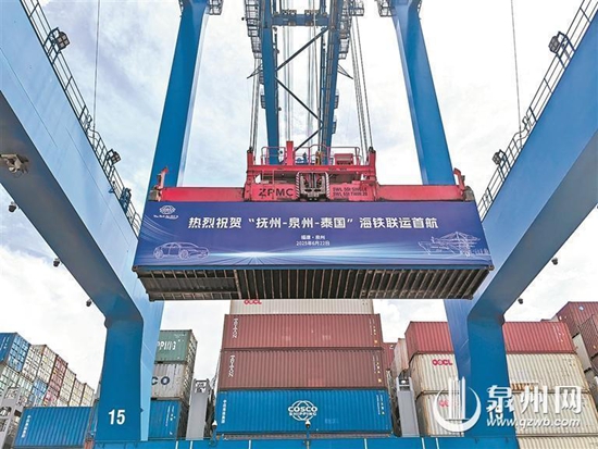 闽赣中部开辟物流新通道 “抚州-泉州”海铁联运昨日首航 昨天上午,在泉州港石湖作业区6号泊位,来自比亚迪江西抚州基地生产的新能源汽车产品,经铁路班列运输至泉州后搭乘“晴春”集装箱船,通过“泉州港-泰国”外贸航线发往泰国林查班,标志着闽赣中部物流新通道正式开通运行。