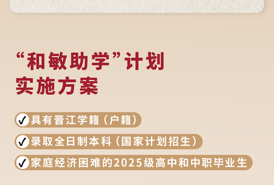亲爱的2025级晋江高考学子们: 展信快乐! 此刻,你们或许已经拿到了高中生涯的最后一张成绩单,望着窗外蝉鸣轻舒一口气;或许正和同窗击掌,把三年写满笔记的草稿纸叠成纸飞机——恭喜你们,终于跨过了人生这场重要的“通关战”!那些早自习时沾着露水的课本、晚自习后教室最后一盏灯、草稿纸上反复修改的解题步骤,都在今天变成了闪着光的勋章。 这一条求学之路你们走得不容易。有人凌晨五点在厨房边热粥边背单词,有人为了一道题追着老师问到办公室锁门,有人悄悄藏起学习的疲惫,只在家人面前扬起笑脸……但你们用坚持写就的故事,已经足够动人。 现在的你们,或许正憧憬着大学的模样,可如果此刻,你心里还藏着一点“担心”——担心学费、担心生活费、担心给家人添负担, 别怕,“和敏助学”计划将助你一路追梦,实现梦想。 自2022年起,为帮助晋江学籍(户籍)家庭经济困难的学生顺利完成学业,和敏基金会与晋江市学生资助中心联合组建“和敏助学”计划资助工作小组,对符合资助条件的贫困学生,采取全学段的资助方式,每年资助每生8000元的资助金,直至完成学业。同时,资助工作遵循个人意愿,对受助学生个人隐私一律保密。 截至2025年6月,项目已资助学生1114人,总资助金额1778万元。 少年逐梦,本就该无拘无束。那些你熬的夜、写的字、攒的劲,终会在大学校园里开出更美的花。无论你选择扎根家乡建设,还是奔赴远方探索,我们都会站在你身后,像晋江的风一样,轻轻托着你往前。 愿笔锋所至,皆成心之所向;愿风里有光,伴你奔赴山海。 安踏集团和敏基金会“和敏助学”计划项目组 2025年6月24日
