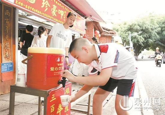 一名小朋友在市区南俊路一家爱心奉茶点喝水解渴 (张九强 摄) 酷暑送清凉 奉茶润人心 1日下午,在丰泽区泉秀街道一家药店前的爱心奉茶点,不时有群众前来接茶水,路过的外卖员小苏就是其中一位。他一脸汗珠,用水杯接了一壶茶水后酣畅淋漓地喝起来,随后露出了满足的表情。“既清凉解渴,又能省钱。”小苏说,爱心奉茶点的茶水不仅清凉降暑还能帮他省去买水的钱和时间。 “我每天自带的水喝完后都会来这边接茶水。”在鲤城区承天巷一家商铺前的爱心奉茶点,环卫工张阿姨告诉记者,现在天气炎热,她每天出门带的水到中午基本就喝完了。爱心奉茶点的茶水消暑解渴而且免费供应,为像自己一样的户外劳动者带来了清凉与便利。 “头一次见到这么多爱心奉茶点,点赞!”在鲤城区西街旧馆驿巷口一爱心奉茶点处,来自北京的李女士为泉州市区随处可见的爱心奉茶点连连点赞。她觉得这些奉茶点不仅让游客在炎炎夏日中感受到了清凉,也体现了城市的文明和爱心。 记者在走访中了解到,爱心奉茶点的设立者有商家、社区、企事业单位、爱心人士等,提供的茶有古早味的茶饼、菊花茶、茵陈茶等各种消暑茶。许多奉茶点都是从早摆到晚,有的奉茶点全年设立,每日提供的茶水多的可达三四桶。