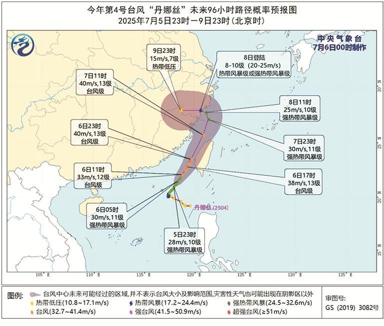 今年第4号台风“丹娜丝”5日22时中心位于台湾鹅銮鼻西偏南方向约315公里的海面上(北纬20.9度、东经118度),中心附近最大风力10级(28米/秒)。预计台风中心将以每小时10公里的速度向北偏东方向移动,强度逐渐增强,最强可达台风级(12~13级,33~40米/秒),并逐渐向我国台湾岛西南部到福建北部一带沿海靠近。