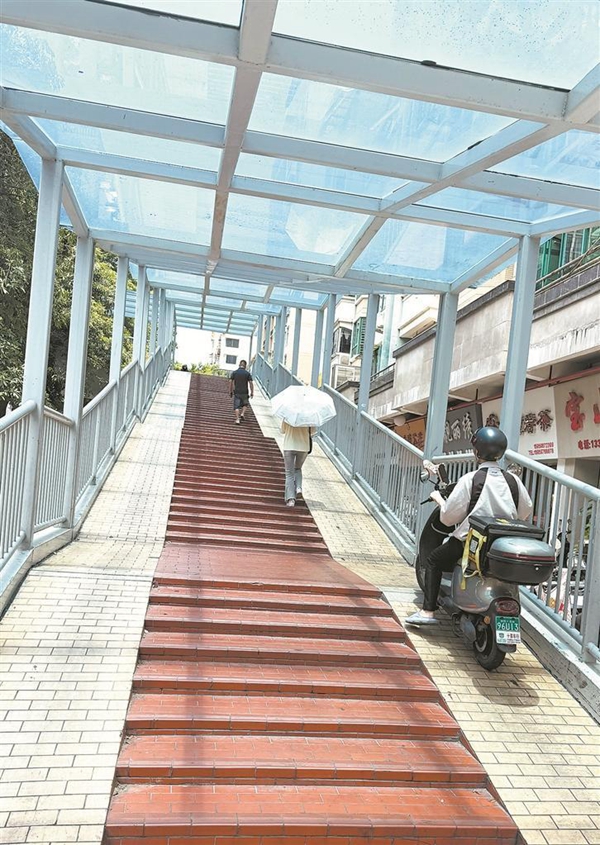 泉州师范学院门口的人行天桥经过改造,有的市民选择推行,有的选择骑行通过。 泉州师范学院门口的人行天桥经过改造,铺设了粗糙面刻槽防滑地砖以提升防滑性,同时天桥一侧为台阶、一侧为斜坡,实现了“人车分流”。不过,较大的坡度仍让通行体验打了折扣:骑行时需格外用力保持平衡,下坡时又得时刻控速防冲,即便推行也因坡度较大而费力。“改造过后变化还是挺明显的,下雨天也不会打滑了。”市民陈女士坦言,但坡度还是有些陡,上坡骑不动,下坡又冲太快,车多的时候还是会有一些担心。 相比之下,东海“四瓣花”天桥的非机动车道则令人眼前一亮:蓝红双色防滑路面平整流畅,坡道坡度平缓、曲线过渡自然,电动车骑行时稳定顺畅;空间规划清晰,非机动车与行人通道分离,避免冲突。“终于不用推车过桥了!”通勤族林女士点赞,“新建天桥考虑到电动车需求,不仅通道宽且坡度平缓,早晚通行高峰都不会拥挤。以前过马路不但要等红绿灯,而且还要和汽车混行,现在3分钟就能顺畅通过,方便太多了。”