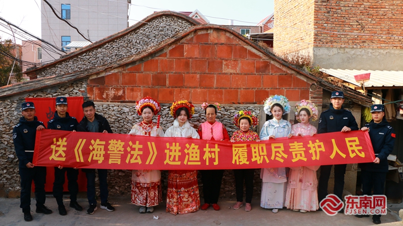 2024年2月,泉州海警局执法员在丰泽蟳埔渔村与头戴簪花的蟳埔女一起宣传《海警法》。潘振泽 供图