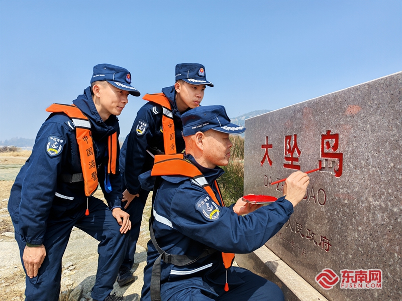 2025年3年,泉州海警局执法员实地踏查大坠岛,并为岛标进行描红。潘振泽 供图