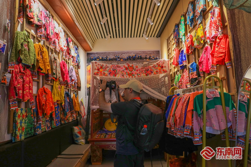 在惠女海韵休闲街区的惠女服饰体验店内,挂满色彩斑斓的各式短衫、黄斗笠,吸引自媒体博主驻足拍摄。东南网记者 林婕 摄