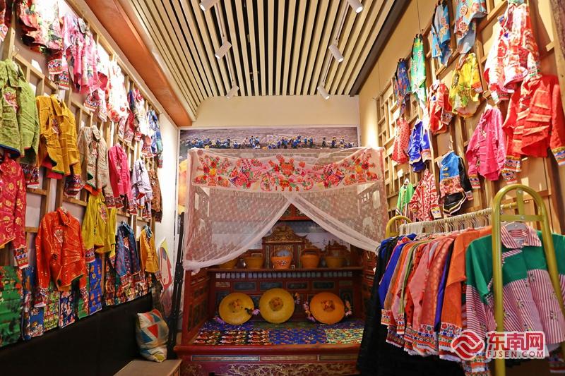 在惠女海韵休闲街区的惠女服饰体验店内,挂满色彩斑斓的各式花头巾及短衫、宽筒裤、黄斗笠。东南网记者 林婕 摄