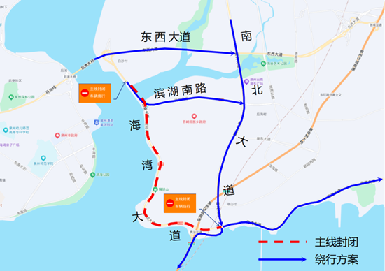 泉州百崎通道A2合同段将于近期开展跨海湾大道节点施工。为确保工程建设的顺利进行和施工期间的交通安全,根据《中华人民共和国道路交通安全法》第三十九条规定,决定对海湾大道施工路段实施交通限制。具体如下: 一、 限制时间 2025年7月26日-2025年8月4日,每日0:00起至6:00止。 二、 限制措施 (一)海湾大道北至白奇大桥北侧引桥起点,南至海湾大道与南北大道交叉口,主线双向进行全封闭施工,禁止车辆及行人通行(施工车辆除外)。 三、 分流措施