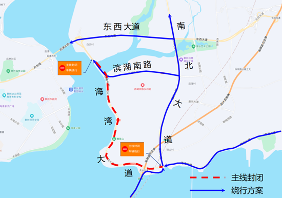 (一)建议市区、晋江、南安往崇武方向过境交通:①由后渚大桥→东西大道→南北大道→海湾大道绕行;②由后渚大桥→海江大道→海湾大道辅道→滨湖南路→南北大道→海湾大道绕行。