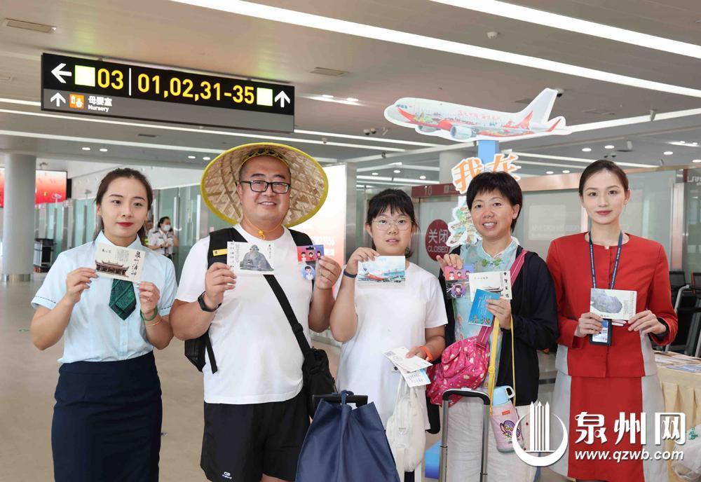 在泉州晋江国际机场候机楼,游客持明信片合影。(融媒体记者陈英杰 摄)