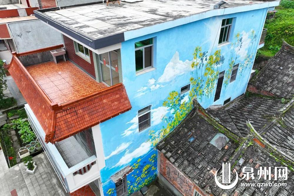 民居外墙绘着油菜花图案