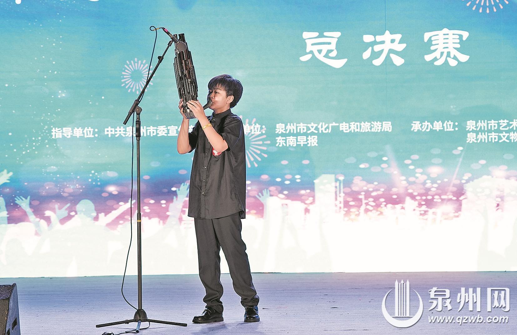 决赛当晚7点,上百名观众早早地来到现场,等待决赛的开启。经过先前的抽签,28组选手依次登场,十八般技艺齐上阵。首先登场的是器乐组选手,15位来自泉港锦山宫北管传承基地的泉州北管爱好者,在舞台上用中外乐器“吹拉弹唱”。队伍中现年91岁的“老顽童”庄金辉,从19岁开始学习双清(福建月琴),不用看谱就能演奏众多曲子。