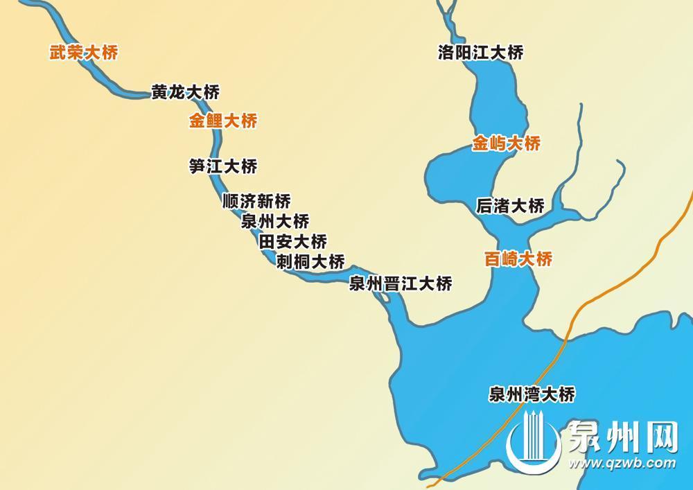 目前,泉州市区已建成通车多座现代化跨江桥梁(不含高速公路桥),分别是跨越晋江的泉州晋江大桥、刺桐大桥、田安大桥、泉州大桥、顺济新桥、笋江大桥、黄龙大桥,跨越洛阳江的后渚大桥、洛阳江大桥。