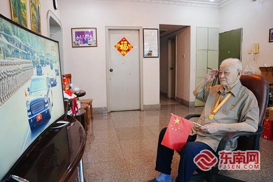 观看阅兵仪式过程中,李祖景郑重敬了个礼。东南网见习记者 杜志鑫 摄 东南网9月3日讯(本网记者 傅心玫)9月3日上午,纪念中国人民抗日战争暨世界反法西斯战争胜利80周年大会在北京天安门广场隆重举行。在泉州市丰泽区的家中,96岁的抗战老兵李祖景早早守候在电视机前,全程观看了这场盛大的阅兵仪式。 “兴奋、激动。”阅兵仪式开始后,李祖景不断提起这两个词,看着人民军队威武雄壮的队伍和现代化武器装备,李祖景难掩激动之情,看着一个个受阅方阵,他面向电视,郑重敬了个礼,“中国人民抗日战争胜利80周年”纪念章在胸前熠熠生辉。这枚纪念章是泉州市领导不久前到家中看望慰问李祖景时为他颁发的,代表着国家和人民对抗战老兵的崇高敬意。 抗日战争时期,地处福建东南的泉州虽不是沦陷区,却同样饱受日本帝国主义在政治、经济、军事上的各种侵略,民众深受其害。1942年,年仅13岁的李祖景满怀报国之志,参加地下工作,以中共泉州中心县委交通员的身份投身抗战。 “我们国家真的强大了。”当一个个方阵从天安门前走过,李祖景感慨不已,“这场阅兵仪式告慰先烈的在天之灵,告诉大家,别人再也不敢侵犯祖国了”。 |