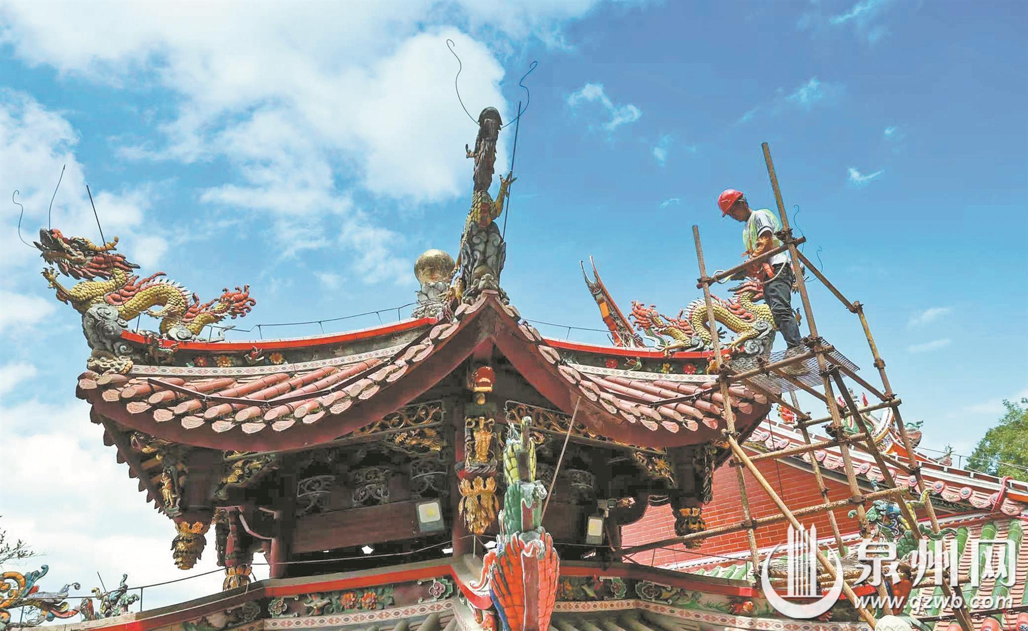日前,记者来到仙公山山顶看到,10多栋殿、楼、亭相邻,形成颇为壮观的建筑群。在多栋建筑上方,工人们忙着架设避雷设施。仔细观察可以看到,不少建筑屋顶上都架起了由中心向四周延伸的铜棒,犹如为屋顶装上了“保护罩”,建筑下方拖着一条套着醒目黄色绝缘套的铜排。