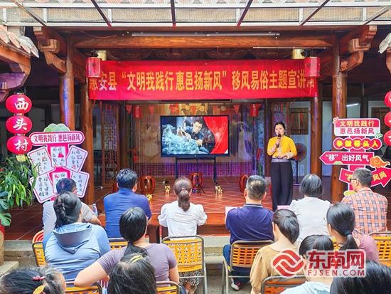 移风易俗宣传活动。惠安县委宣传部 供图 近年来,福建省泉州市惠安县紧扣习近平新时代中国特色社会主义思想主题主线,结合群众思想和生产生活实际,创新建设了群众身边的理论宣讲“轻骑兵”——惠明理·乡村文明宣讲小分队,推动宣讲队伍、资源、活动“三下沉”,突出做好“短平快”“鲜活实”微宣讲,在上下联动、整体协同中探索出一条“机制活、队伍精、活动亮、形式新”的乡风文明理论宣讲路径,扎实推动党的创新理论深入基层、深入群众、深入人心,有效破解陈规陋习,推动崇廉尚俭、崇德向善蔚然成风,成功助力惠安获评“全国文明城市”,相关经验做法多次获中宣部推广和上级领导批示肯定。 健全机制,畅通全周期全流程的“管理脉络”。坚持牵头抓总、高位推进,加强顶层设计和统筹规划,确保资源整合一盘棋、工作推进一条链,推动党的创新理论落地生根、见行见效。一是高位统筹定方向,机制保障筑根基。联合县直相关部门印发《关于开展“文明我践行 惠邑扬新风”移风易俗主题宣讲活动的通知》《关于开展2025年惠安县“文明仲夏夜 清风润万家”文明实践暨移风易俗宣传宣讲主题活动的通知》等文件,从主题策划、组织协调、人员选配、活动宣讲等各个关键环节,全流程织密工作机制网络,推动理论宣讲工作跳出“零散化”局限,确保理论宣讲工作常态化、规范化、制度化开展。二是培训练兵强本领,精研业务筑根基。加强惠明理·乡村文明宣讲小分队宣讲队伍日常管理和培训交流,开展“凝聚榜样力量·践行核心价值观”主题宣讲活动宣讲员培训活动,组织道德模范、身边好人先进事迹宣讲员、各镇乡村文明讲解员等,以现场授课和实地宣讲的形式进行集中授课,探索可复制可推广的宣讲前期策划、备课试讲、媒体传播等宣传宣讲模式,形成一套分工明确、衔接紧密和运转高效的宣讲流程,确保每名宣讲员“上讲台能讲、进田间会讲”。三是财政倾斜强保障,基层宣讲添动能。加大财政对基层理论宣讲工作的支持,在宣讲队伍的组建、培训、宣讲及购买宣讲设备、学习材料等方面给予保障,推动各类志愿服务组织积极承接理论宣讲志愿服务项目、落实宣讲经费补贴,为基层宣讲注入强劲动能,确保理论宣讲工作有力有序推进。 建强队伍,烹制适合群众口味的“精神食粮”。全面整合各类宣讲人才资源,深化拓展“乡村文明”宣讲课堂,做到群众在哪里,课堂就设到哪里。一是突出“主味”,宣讲团集中讲。由县委文明办、县农业农村局、县民政局抽调干部,联合学校宣讲骨干、文艺宣讲骨干,共同组建惠明理·乡村文明宣讲小分队,分赴全县12个镇、公园、广场、街区等,开展《以厚养敬亲恩 用薄葬树新风》《孝润惠安 德耀海疆》《让婚姻回归纯粹 以文明浸润惠安》等主题宣讲,2025年以来,集中开展移风易俗主题巡回宣讲活动100多场次,让带着泥土味、人情味、时代味的理论新风成为惠安大地温润的文明气息。二是灵活“配餐”,镇村干部流动讲。发动镇村干部、网格员、志愿者等组建“流动宣讲轻骑兵”,骑着电动车、拎着扩音器,进村入户“面对面”宣讲。在村口榕树下、戏台旁、渔港码头布设“新风小摊”,现场宣讲解读红白事减负、文明祭祀新规等。印制移风易俗公益广告海报5000份,发放移风易俗宣传折页、倡议书5000多份,多形式营造移风易俗、文明新风浓厚氛围。三是创新“工艺”,文艺能人多样讲。组织县高甲戏艺术保护传承中心、南音社、民间文艺达人等文艺能人,以田畴为幕、以巷口为台,把“大道理”写成“小曲段”,把“文明语”编进“锣鼓点”,先后创排快板节目《移风易俗新貌传》、小品《红围巾》、三句半《倡文明扬新风》等文艺宣讲作品,把乡村文明、移风易俗知识“唱出来、演出来、舞出来”,通过文艺能人“以艺载道”,使党的创新理论化作耳熟能详的乡音、生动可感的画面。