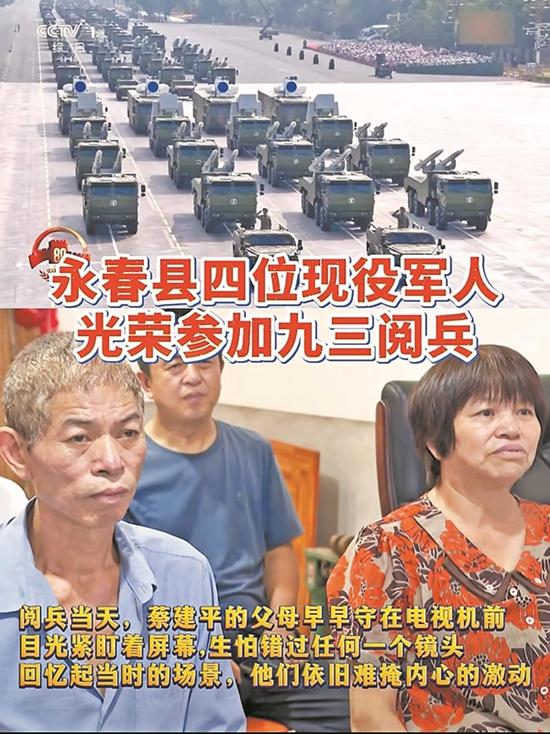 蔡建平一家早早守在电视机前观看阅兵式 (永春融媒体中心视频号) 9月3日上午,纪念中国人民抗日战争暨世界反法西斯战争胜利80周年大会在北京天安门广场隆重举行。在这场举世瞩目的阅兵盛典中,永春县的蔡建平、黄超群、潘庆军和洪伟生四位现役军人光荣受阅,为家乡增添荣耀。 据了解,四人中,蔡建平是驻闽某部二级上士,1995年出生于永春五里街镇吾东村,2015年9月参军入伍。黄超群是永春吾峰镇人,潘庆军和洪伟生是达埔镇人。 阅兵当天,蔡建平的父母早早守在电视机前,目光紧盯着屏幕,生怕错过任何一个镜头。据了解,这是蔡建平入伍以来首次参与重大国家级阅兵活动,这份荣誉让他和家人都倍感珍视。 “很高兴,国家和政府、部队将孩子培养得很优秀,有机会参加阅兵,我们很激动,很骄傲。” 蔡建平的父亲蔡谋标说。 据父母介绍,蔡建平从小就对军营充满向往,立志要为国防现代化贡献自己的力量。大学毕业后,他毫不犹豫报名参军,把年少时的梦想变成现实。 在部队里,蔡建平始终严格要求自己,勤奋刻苦,表现优秀。他从不在家人面前提训练的艰辛、任务的繁重,每次打电话都报喜不报忧。“平时出任务,我们问他在哪里,他总是说您不用担心,您自己照顾好自己就好,我们很好,很安全。” 蔡建平母亲庄淑珍说。 如今,看到儿子能在全国人民面前展现军人风貌,蔡建平的父母既欣慰又骄傲。他们表示,会一直做儿子的坚强后盾,也希望他能在部队继续努力,为国防事业贡献更多力量,不辜负国家的栽培。(融媒体记者陈玲红 通讯员谢丽琼 颜彩虹) |