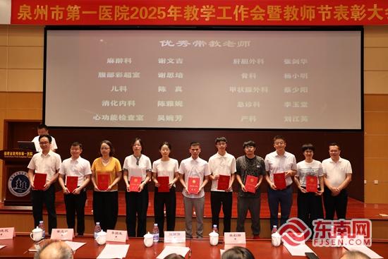 优秀带教老师颁奖。东南网记者 林婕 摄 东南网9月10日讯(本网记者 谢玉妹 通讯员 陈孙郴)2025年9月10日是我国第41个教师节,当天,泉州市第一医院举办了一场别开生面的教学工作会暨教师节表彰大会。大会汇聚多方教育与医疗领域力量,总结教学工作成果,表彰教学先进典型,共话医学教育发展,为医院教学工作高质量推进注入新动力。 福建医科大学教务处副处长张丽芳、学工处副处长卓彩静,泉州市卫健委党组成员、副主任、泉州市第一医院党委书记王家春,泉州市卫健委副主任李招发,泉州市第一医院院长黄志扬等出席会议。 据黄志扬介绍,作为泉州市域内体量最大、承担疑难危重患者救治任务最多的三甲综合医院之一,泉州市第一医院先后成为福建省和国家首批住院医师规范化培训基地,拥有15个专业基地,覆盖内科、外科、全科、重症医学科等关键领域。同时,还承担了8所高等院校的临床教学任务。目前在培住院医师570人,见习、实习生303人,短期见习生382人,为省内设区市规模最大。 “医学教育是卫生健康事业发展的基石,人才兴则卫生兴,人才强则医疗强。”李招发指出,当前,泉州正处在加快建设“健康泉州”、推进卫生健康事业高质量发展的关键时期,群众对优质医疗服务的需求日益增长,对医学人才的数量、质量提出了更高要求。他强调,要持续深化教学改革,打造具有泉州特色的医学教学模式;强化师资队伍建设,打造一支“医德高尚、医术精湛、教艺娴熟”的双师型教学队伍;聚焦人才培养质量,让他们成长为有温度、有担当的医务工作者。 据了解,泉州市第一医院是福建医科大学的非直属附属医院和重要临床教学基地。张丽芳表示,将进一步深化与泉州市第一医院的医教协同合作,聚焦人才培养质量,创新教育教学模式,共同推动临床教学工作的内涵式、高质量发展,培育出更多能够担当民族复兴大任、护佑人民健康的医学人才。会上,泉州市第一医院副院长张翼作2024-2025学年教学工作汇报,通过翔实的数据与具体案例,全面梳理了医院在住培管理、教研室建设、临床教学改革等方面的工作成果,深入分析当前教学工作中存在的问题,并明确下一阶段的工作重点。现场还表彰了“优秀住培医师”“优秀理论授课老师”“优秀带教老师”“优秀住培导师/研究生导师”“优秀教学管理者”“优秀带教科室”“住培专业基地”等一批先进个人和集体。 当天,还举行了病理科教学协同单位签约仪式、全科基层实践基地签约仪式。两项重要教学合作为泉州市第一医院和晋江市医院在病理科教学资源共享、人才联合培养等方面将开启深度合作新篇章,也进一步完善了泉州市第一医院全科医学人才基层实践培养体系,为提升全科医师临床实践能力搭建了更广阔的平台。 |