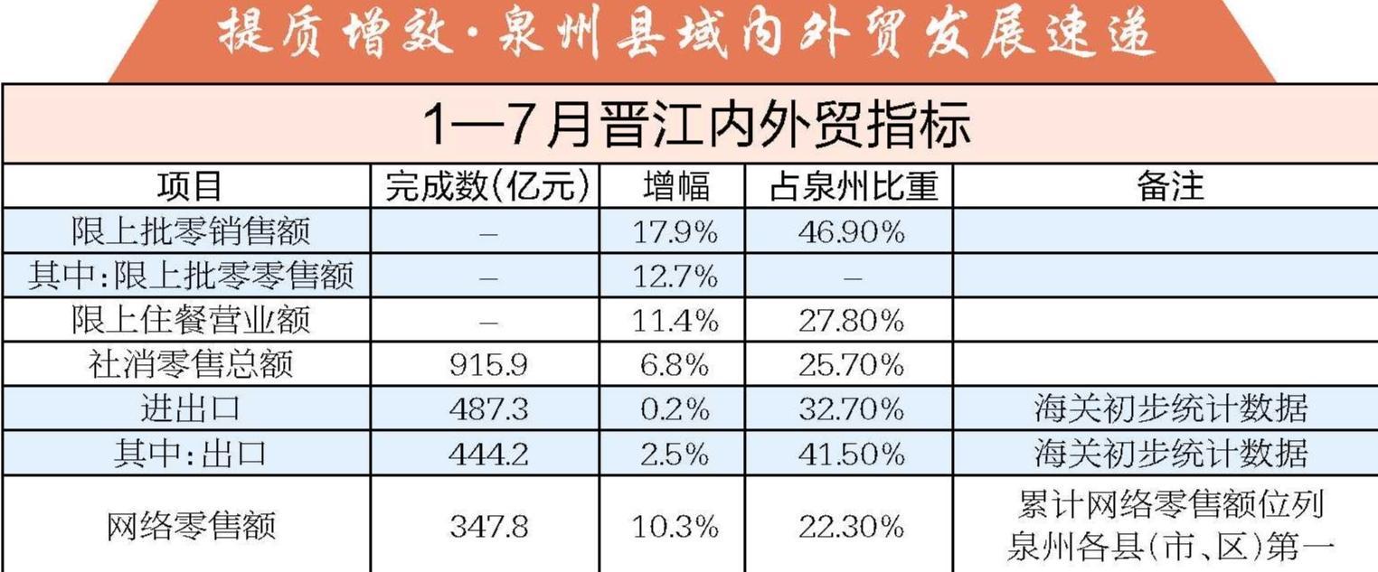 1—7月限上批零销售额较去年同期增长17.9%,外贸出口444.2亿元,较去年同期增长2.5% 安踏园区内,4000平方米的运动仓储式“工厂直营店”不再只是卖货场,已转变为集体验与消费于一体的沉浸式运动乐园;紫帽山下,七大国潮品牌以山水为幕,在流动T台上演绎“晋江制造”的时尚魅力;七匹狼中国男装博物馆中,研学学生触摸从老式缝纫机到智能剪裁的技术变迁,感受本土品牌的产业积淀…… 这些场景,是晋江以“产业IP+文旅地标”融合模式解锁新增长极的生动缩影。作为“晋江经验”的发祥地,这座工贸强市正以市场驱动为导向、工贸一体为路径,在双循环新格局中书写高质量发展新篇章。 “在泉州市委、市政府的坚强领导下,当前我们正以‘晋江经验’为引领,通过内外循环双向互促、工贸一体融合发展、供给需求协同发力,持续为全市经济高质量发展注入强劲动能。”晋江市内外贸高质量发展总指挥部总指挥长、晋江市市长王明元表示,下一步,将重点做好三个方面:一是打造闽南地区消费中心。充分发挥龙头品牌集聚效应与工业旅游资源优势,以“产业场景化、消费体验化”为核心,助力企业将科技新品、国潮优品融入工业旅游场景,同步全力打造“超级晋江”品牌店等融合工业旅游元素的新型消费场景,大力培育首店经济、银发经济、票根经济,持续激发市场消费活力。二是打造工贸融合标杆城市。把建设2.0版标准化园区作为工贸一体发展的战略支点,因地制宜引进一批供应链配套贸易和AI大模型、数字赋能、金融财会、时尚研发等高端业态,推动生产性服务业与制造业互促互进,加快由“制造驱动”向“市场链接”延伸升级,实现园区效益充分释放、产业规模倍增。三是打造双循环发展链接支点。加快推进鞋服纺织、食品、伞业等全国供应链创新中心建设,强化鞋纺城、机场、围头港、陆地港、综保区等要素联动协作,构建辐射全国、联通国际的立体化综合物流枢纽。完善出海服务矩阵,鼓励企业并购海外品牌、技术平台,培育打造一批“新晋江系”电商品牌簇群,助力企业抢占国内外多元市场,让“晋江优品”贸通全球、享誉世界。