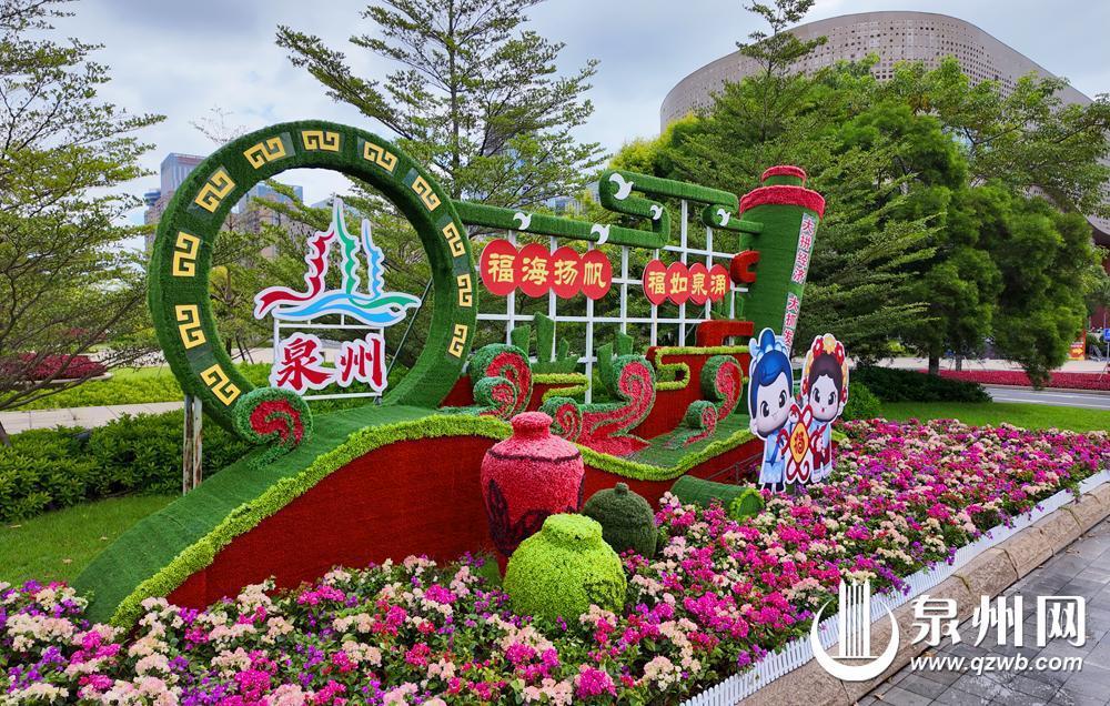 国庆佳节将至,泉州市区东海中央商务区,各色花草搭配组合形成了色彩斑斓的花带,营造出喜庆祥和的节日氛围。