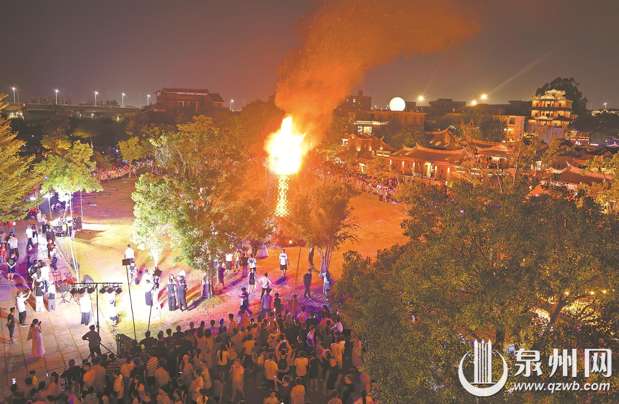 10月6日晚,晋江梧林传统村落举办烧塔仔民俗活动,让游客感受传统佳节氛围。(陈英杰 摄)
