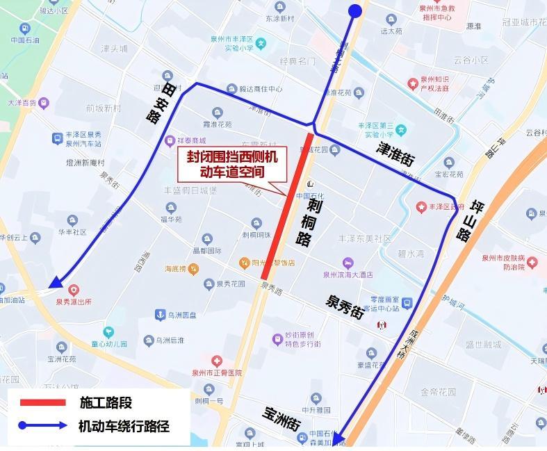 刺桐路(津淮街—泉秀街)西侧封闭施工 机动车禁止通行 请提前绕行避开 “刺桐路西侧津淮街往泉秀街这段怎么封闭起来了?何时恢复通行?”昨日,市民陈先生拨打泉州晚报社24小时热线96339反映,他周末驱车经过刺桐路时,发现津淮街路口设置了围挡,禁止机动车直行,他不得不绕行到田安路。对此,记者走访了解到,目前刺桐路(津淮街—泉秀街)西侧正在封闭施工,禁止一切机动车通行,提醒市民绕行避开施工区域。