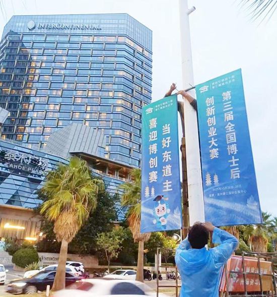 第三届全国博士后创新创业大赛总决赛将于明日正式启幕。近段时间,在泉州中心城区和晋江,主题鲜明的赛事横幅标语随处可见,赛事热度氛围拉满。 重要干道上,在泉州中心城区8个主要天桥、隧道口完成悬挂;在高速出入口、高架立交、晋江国际会展中心等重要区域布置了16个大型广告牌,向社会清晰传递博创赛的相关信息;在泉州迎宾馆上山道路、通港街、法坊路、丰海路、海星街等10余条大赛通勤主要干道安装285根灯杆旗。 公共交通上,精选泉州中心城区7条公交线路,在公交车车身以及位于购物中心、旅游景点和交通枢纽等处客流量大的20个公交候车亭,发布系列赛事宣传海报和主题标语;在晋江世纪大道、泉安路、双龙路等重要路段32个公交站点投放宣传版面,形成高强度、多频次的视觉宣传体系。 |
