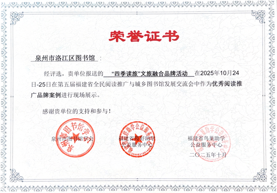 在“书香八闽”全民读书月的浓厚氛围中,于泉州举办的“数智时代城乡阅读推广交流展示活动——第五届福建省全民阅读推广与城乡图书馆发展交流会”上,洛江区图书馆“四季读旅”文旅融合品牌活动凭借其创新模式与显著成效,成功获评2025年福建省优秀阅读推广品牌案例,并在交流会上获得展示与表彰。 本届交流会指导单位为中共福建省委宣传部,主办单位为中共泉州市委宣传部、福建省全民阅读促进会,承办单位为泉州市图书馆学会等,主题为“如何真正激活阅读推广的最后一公里:福建城乡阅读生态的构建与创新”。交流会上展示了一批具有代表性、富有创新性的阅读推广及数智化应用案例,集中展现我省各级各类阅读推广单位面向基层开展的阅读推广成果,展示数智技术在赋能城乡阅读活动中的创新应用,促进相关经验的交流与共享。 洛江区图书馆依托“四季读旅”文旅融合品牌活动,围绕本土文化、生态保护、非遗传承等主题,开展沉浸式研习活动,如红树林观鸟、洛阳桥历史探访、非遗洞箫体验、俞大猷爱国教育等,融合阅读、实践与互动。服务目的是拓展服务维度,深化文旅融合,以创新形式让参与者在体验中感悟文化,于实践中升华情怀,达成“游中学、学中悟”的目标。 自2024年4月启动以来,洛江区图书馆已成功举办7场“四季读旅”主题活动,服务读者超400人次。活动面向市民读者、亲子家庭及青少年学生等广泛群体,内容覆盖多元主题。活动收获众多好评,反响热烈。 “四季读旅”文旅融合品牌活动是洛江区图书馆在新时代背景下,积极拓展服务边界、创新阅读推广形式的生动实践。它证明了,通过精心的策划与融合,阅读可以变得更加生动、立体而富有感染力,真正走进生活,深入人心。(郑胜男) |