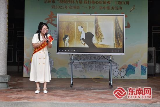 铁崖书院揭牌仪式。东南网记者 吴雅艺 摄 东南网10月31日讯(本网记者 吴雅艺)为深入学习宣传贯彻党的二十届四中全会精神,推动全会精神扎根基层、浸润民心,10月29日下午,泉州市“凝聚榜样力量•践行核心价值观”主题宣讲(安溪专场)暨2025年安溪县文化科技卫生“三下乡”在官桥镇铁崖书院举办。 活动现场,3位“泉州市时代新风传播人”到场分享生动感人的故事——泉州市时代新风传播人、道德模范王美芳老师分享她深耕讲台,用爱心浇灌童心,教书育人的故事和感想;“泉州市时代新风传播人”、瓷都云谷电商物流园公司游俊煌讲述道德模范孙炳章白天站讲台教“人之初”,夜晚管论坛、周末跑山沟,用二十年坚守织就公益路的暖心故事;“泉州市时代新风传播人”、2024年度中国好人詹惠阳用实际行动生动诠释“以爱为帆,守护生命”的动人故事。 此外,《直入花园》《风打梨》等婉转悠扬的南音旋律让观众们沉浸在闽南文化的韵味中;《在希望的田野上》《欢乐农家》《我爱你中国》等乐器演奏将现场的氛围拉至高潮;《绣茶香》《中华颂》以及《春风十万里》等舞蹈、朗诵以及独唱等节目穿插其中,让现场观众们在享受音乐盛宴的同时也能进行一场灵魂的隔空对话。 活动现场还举行了铁崖书院揭牌仪式,同步设有科普展示、图书展销、应急救护知识普及培训及三献宣传,非遗剪瓷雕体验、版画送福、非遗林氏正骨等服务项目。 版画送福。东南网记者 吴雅艺 摄 南音表演。东南网记者 吴雅艺 摄 泉州市时代新风传播人、道德模范王美芳做主题宣讲。东南网记者 吴雅艺 摄