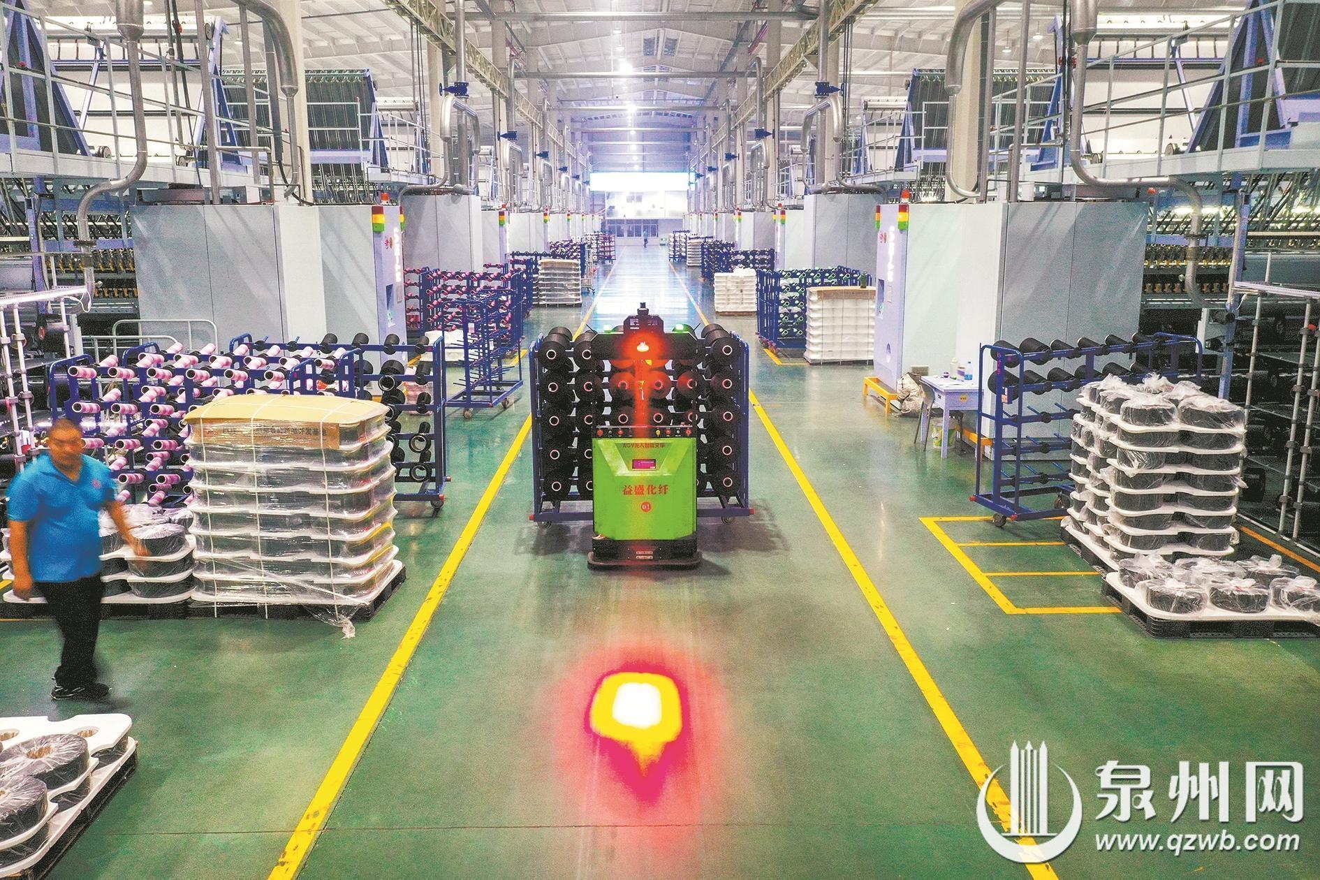 近年来,泉州市传统纺织企业纷纷向“新”求质,积极推进“智改数转”。日前,石狮市益盛化纤织造有限公司的5G智能车间投产,在涤纶丝生产车间,只见一捆捆成品刚下生产线不久,无人运输叉车便精准赶来,将产品快速、有序转运至包装车间,整个转运过程实现无人化。(融媒体记者陈小阳 王树帆 通讯员颜华杰 摄)