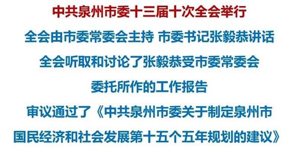 中国共产党泉州市第十三届委员会第十次全体会议,于2025年11月28日在泉州举行。 出席这次会议的有市委委员30人,市委候补委员8人。市纪委常委、市监委委员和有关方面负责同志,泉州市党的二十大代表、省第十一次党代会代表和市第十三次党代会代表中的部分专家学者、基层代表等列席会议。 全会由市委常委会主持。市委书记张毅恭讲话。 全会深入学习贯彻党的二十届四中全会精神和习近平总书记在福建考察时的重要讲话精神,听取和讨论了张毅恭受市委常委会委托所作的工作报告,审议通过了《中共泉州市委关于制定泉州市国民经济和社会发展第十五个五年规划的建议》。张毅恭就《建议(讨论稿)》向全会作了说明。 全会认为,党的二十届四中全会,是在即将进入基本实现社会主义现代化夯实基础、全面发力的关键时期召开的一次十分重要的会议。全会通过的《建议》,是指导“十五五”时期经济社会发展的纲领性文件。要把学习好贯彻好党的二十届四中全会精神作为当前和今后一个时期的重大政治任务,认真落实省委十一届九次全会部署要求,在深学细悟中把握核心要义,在对标对表中找准实践路径,在笃行实干中彰显责任担当,切实把思想和行动统一到党中央决策部署上来。 全会充分肯定了今年以来市委常委会的工作。一致认为,市委常委会深入学习贯彻习近平总书记在福建考察时的重要讲话精神,传承弘扬、创新发展“晋江经验”,聚焦“奋勇争先、再上台阶”,持续深化拓展“深学争优、敢为争先、实干争效”行动,持续大拼经济、大抓发展,深入实施“抓项目、促发展”系列专项行动,勇当新时代民营经济强省战略主力军,持续推动经济平稳健康发展,推动科技创新和产业创新深度融合,进一步全面深化改革和扩大高水平开放,推动区域协调发展和城乡融合发展,加快建设文化强市、旅游强市,积极探索海峡两岸融合发展新路,扎实推进社会主义民主法治建设,切实做好民生保障和生态保护,纵深推进全面从严治党,扎实开展深入贯彻中央八项规定精神学习教育,“十四五”主要目标任务即将顺利完成。 全会高度评价“十四五”时期泉州发展取得的重大成就。一致认为,“十四五”时期泉州发展历程极不寻常、极不平凡。面对错综复杂的外部形势和艰巨繁重的改革发展稳定任务,市委坚持以习近平新时代中国特色社会主义思想为指导,坚决贯彻落实习近平总书记重要讲话重要指示批示精神和党中央决策部署,在省委领导下,团结带领全市人民传承弘扬、创新发展“晋江经验”,经受住世纪疫情严重冲击,有效应对一系列重大风险挑战,海丝名城、智造强市、品质泉州建设迈出新的坚实步伐,在第二个百年奋斗目标新征程中实现良好开局。 全会指出,当前和今后一个时期,世界之变、时代之变、历史之变交织叠加,不确定难预料因素增多,战略机遇与风险挑战并存。要深刻领悟“两个确立”的决定性意义,增强“四个意识”、坚定“四个自信”、做到“两个维护”,保持战略定力,增强必胜信心,积极识变应变求变,敢于斗争、善于斗争,以历史主动精神克难关、战风险、迎挑战,扭住目标不放松、一张蓝图绘到底,始终高举“晋江经验”旗帜,扛牢建设两岸融合发展示范区、勇当新时代民营经济强省战略主力军两个使命担当,落实“闯出新路”“奋勇争先”“作出示范”“久久为功”四方面重要要求,夯实民生改善、生态保护、安全稳定等三大保障,奋勇争先推进中国式现代化泉州实践。 全会强调,“十五五”时期泉州经济社会发展,必须坚持马克思列宁主义、毛泽东思想、邓小平理论、“三个代表”重要思想、科学发展观,全面贯彻习近平新时代中国特色社会主义思想,深入贯彻党的二十大和二十届历次全会精神,全面落实习近平总书记对福建、对泉州工作的重要讲话重要指示批示精神,按照省委工作要求,传承弘扬、创新发展“晋江经验”,紧紧围绕加快建设21世纪“海丝名城”、奋勇争先推进中国式现代化泉州实践这一主线,高质量推进两岸融合发展示范区建设这一使命,统筹推进“五位一体”总体布局,协调推进“四个全面”战略布局,完整准确全面贯彻新发展理念,积极服务和深度融入新发展格局,坚持稳中求进工作总基调,坚持以经济建设为中心,以全方位推动高质量发展为主题,以改革创新为根本动力,以满足人民群众日益增长的美好生活需要为根本目的,以全面从严治党为根本保障,努力在推动科技创新和产业创新深度融合上闯出新路,在全面深化改革、扩大高水平开放上奋勇争先,在推动区域协调发展和城乡融合发展上作出示范,在提升文化影响力、展示泉州新形象上久久为功,推动经济实现质的有效提升和量的合理增长,推动人的全面发展、全体人民共同富裕迈出坚实步伐,确保基本实现社会主义现代化取得决定性进展。 全会指出,“十五五”时期泉州经济社会发展必须遵循“六个坚持”重要原则,即坚持党的全面领导,坚持人民至上,坚持高质量发展,坚持全面深化改革,坚持有效市场和有为政府相结合,坚持统筹发展和安全;注重把握好省委“六个必须”基本要求,即必须坚持不懈用习近平新时代中国特色社会主义思想凝心铸魂,必须坚决扛牢党中央赋予的重大使命,必须切实担起经济大省挑大梁的重大责任,必须把改革精神改革思维改革