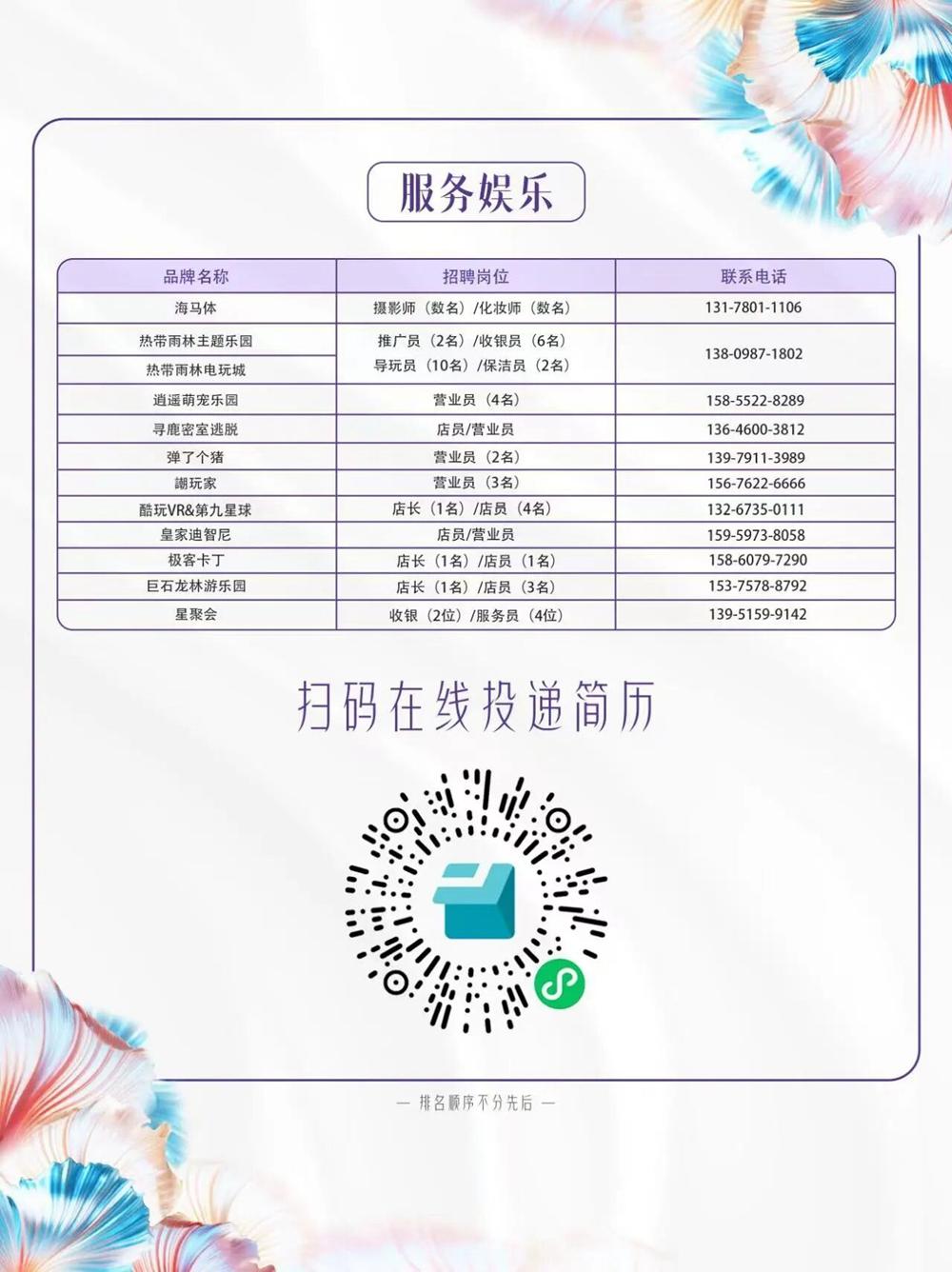 东南网11月29日讯(本网记者 施远圻 通讯员 林思敏)为切实帮助企业破解用工难题、拓宽劳动者就业渠道,11月29日至30日,“汇聚鲤想职引未来”2025年鲤城区暖冬招聘会将在泉州鲤城万达广场1号门外广场举行,每天15:00-18:30开启。 据悉,本次招聘会将集中释放优质岗位1500余个,涵盖零售、餐饮、服务娱乐等领域,致力为求职者与企业搭建高效、精准的对接平台。 随着鲤城万达广场开业进入倒计时,周边服务业中小微企业用工需求集中释放,本次招聘会吸引了100余家企业参与,提供的岗位类型丰富多元,既包含面向基层劳动者的服务岗、操作岗,又涵盖适合大中专毕业生的管理岗、储备岗。招聘对象广泛覆盖外出务工返乡人员、本地待业人员、大中专毕业生、退役士兵及家属等多类群体,力求让每一位有就业意愿的劳动者都能找到适合自己的岗位。 “所有招聘单位和求职者都可免费入场,我们还优化了对接流程,让企业招得省心、求职者找得放心。”鲤城区人社局相关负责人介绍,为保障招聘信息真实有效,用人单位报名时需提交营业执照复印件、经办人身份证复印件及招聘简章。企业可通过泉州鲤城万达广场或泉州市鲤城区零工市场报名参与(联系方式见文末)。 为方便求职者参与,本次招聘会还设置了“线上+线下”双渠道投递方式。求职者既可直接前往招聘会现场,与企业面对面沟通;也可通过“泉州公共就业服务平台”线上查询岗位信息,在线上投递简历;还能通过微信扫描文末招聘会专属二维码,免费完成线上简历提交。 企业报名渠道 泉州鲤城万达广场陈女士:18350550737 泉州市鲤城区零工市场刘女士:18815990772 岗位信息