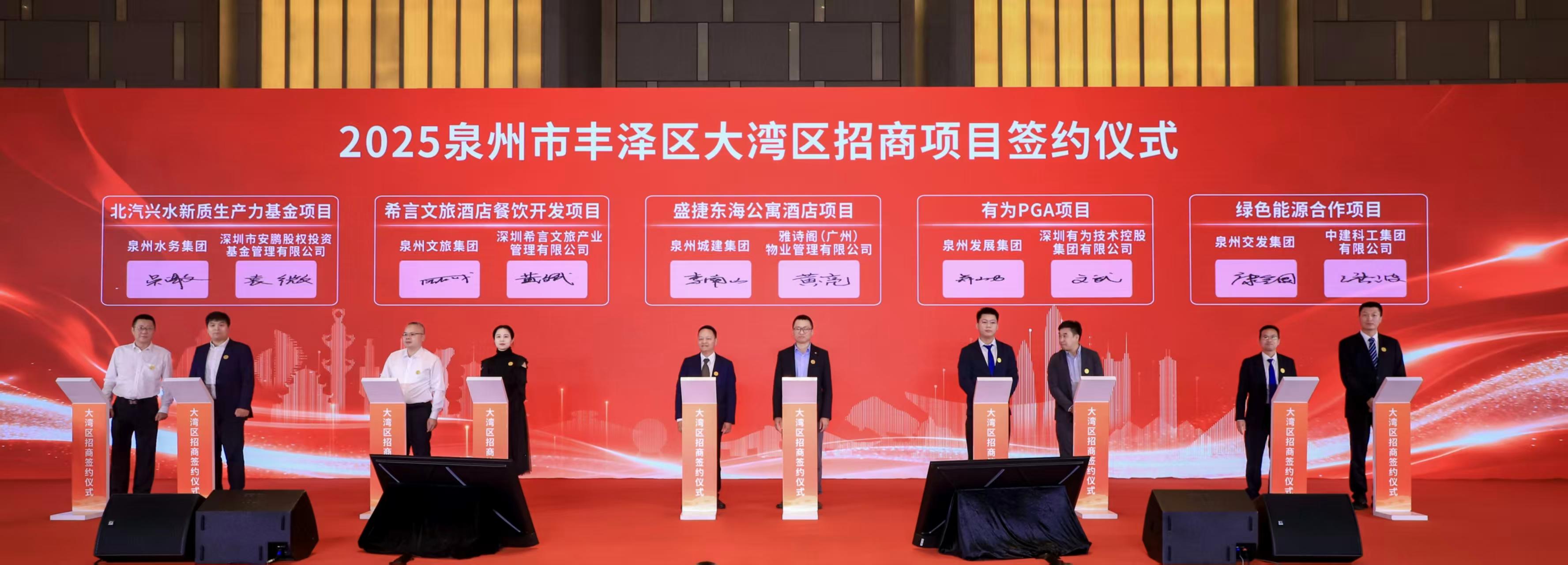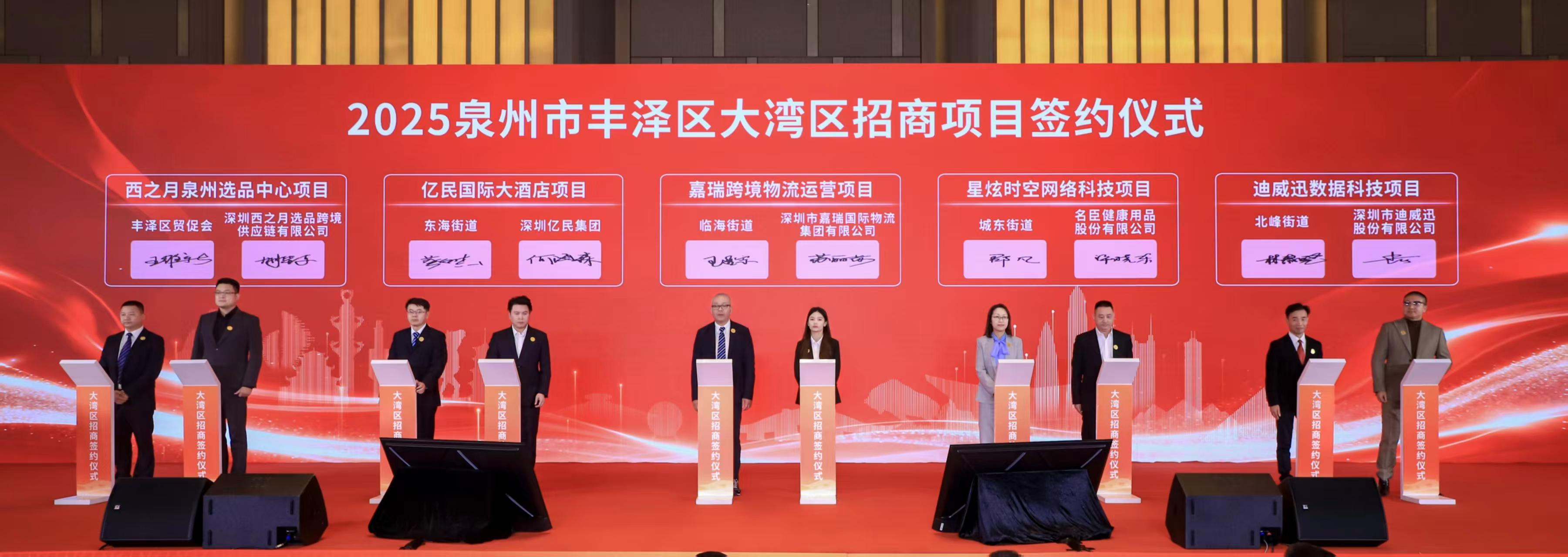 11月21日,在深圳丰泽商会成立一周年之际,丰泽区在深圳市举办以“刺桐花开引凤至 湾区潮涌聚龙财”为主题的粤港澳大湾区招商推介会。本次活动是丰泽区深入贯彻落实市委、市政府驻点粤港澳大湾区招商战略部署的关键举措,集中签约一批优质招商项目,开启丰泽与大湾区在更高层次、更宽领域协同发展的新篇章。 泉州市政府副市长黄春辉,泉州城建集团党委书记、董事长张嘉斌,泉州文旅集团党委委员、副总经理孙佳伟,泉州发展集团党委委员、副总经理刘庆南,泉州交发集团党委委员、副总经理郭定国,泉州水务集团党委委员、总会计师刘秋志等受邀出席。 丰泽区委书记高金全,区政协主席上官蓝波,区政府副区长刘鹏志,区政协副主席、工商联主席许志达,区政协副主席、招商办主任苏伟强,以及项目签约代表、各街道主要负责人、深圳丰泽商会会员代表等参加。 诚邀湾区合伙人 共赢丰泽新未来 推介会上,高金全发表热情洋溢的致辞,他首先向关心支持丰泽发展的各级领导和广大乡贤、企业家,致以最热烈的欢迎和最诚挚的感谢。高金全说,深圳丰泽商会成立一年来,吸纳了近130个会员及会员单位,推动力同科技、科立讯、利腾耀科技等一批优质项目落地泉州、丰泽。这段双向奔赴的合作佳话,让我们深深感受到,广大乡贤始终是泉州、丰泽发展的最硬支撑、最暖依靠、最强底气。 高金全从三方面推介丰泽优势:一是城市有热度,市委、市政府大力支持做大做强中心城区,中央商务区、活力区等超万亩环湾核心区蝶变升级、强势崛起,近三年汇聚优质项目420个、总投资超3000亿元,腾讯、京东、滴滴等30多家500强企业看好丰泽、投资丰泽,簪花热持续带动全城热;二是产业有高度,匠心打造数字经济、现代服务等10大特色产业社区,持续做强人工智能、影视文旅、金融法务等产业集群,数字经济占GDP比重达63.7%、居全市第一,数字经济产业园成为企业投资泉州的首选地;三是服务有温度,全力打造“遵法度、有温度”的一流营商环境,为广大企业家在丰投资提供最强保障,已培育税收超千万楼宇82幢、超千万企业73家、市场经营主体超20万户、各类人才近20万名。 高金全表示,奋进的丰泽,迸发着蓬勃的活力,涌动着无限的机遇。希望深圳丰泽商会一如既往发挥桥梁纽带作用,为家乡发展牵线搭桥、汇聚资源,成为推动泉州、丰泽与大湾区协同发展的重要平台。期盼广大乡贤、大湾区企业家抓住商机、借势发力,把更多优质项目、先进技术、创新理念引入泉州、丰泽,成为建设21世纪“海丝名城”的“最佳合伙人”和“最美代言人”。区委、区政府将始终以最大诚意、最实举措、最优环境,为乡贤和企业家在丰泽这片热土施展抱负、成就事业保驾护航、赋能添力。 硕果盈枝启新程 百亿赋能筑高地 2023年以来,按照市委、市政府驻点粤港澳大湾区招商战略部署,丰泽区精准敲门招商,深入对接项目,积极推进大湾区招商工作,累计推动华润置地、腾讯音乐等30余个项目签约落地,总投资超200亿元。 在此良好基础上,本次推介会进一步取得丰硕成果,集中签约招商项目23个,总投资达128亿元。其中15个代表性项目参加现场签约,涵盖人工智能、数字技术、新能源、现代金融等领域,总投资74亿元,投资主体涉及国企、民企、上市公司,呈现出体量大、领域新、落地实的特点。