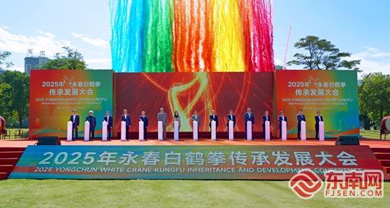 东南网11月24日讯(本网记者 施远圻 郑琦 通讯员 颜彩虹)11月24日,2025年永春白鹤拳传承发展大会举办。来自海内外的武术界代表、文化学者、各级领导嘉宾及国际友人齐聚“白鹤拳故乡”,以拳为媒、以武会友,共同见证这一国家级非物质文化遗产的当代活力与全球影响,共话中华武术的创新发展之路。 大会在气势磅礴的二十四节令鼓表演《鹤脉鼓韵》中拉开帷幕。81岁高龄的省级非遗传承人苏瀛汉携祖孙三代同台展演白鹤拳,展现了非遗技艺的薪火相传;融入白鹤拳元素的永春县青年老师广场舞表演《鹤舞永春》、闽南语原创歌曲《永春》等节目精彩亮相,将传统武术与地方文化深度融合,让现场观众领略了永春白鹤拳“刚柔并济”的独特魅力。