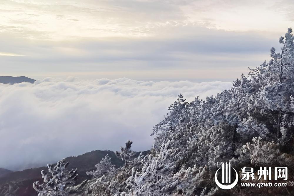 11月中下旬,德化九仙山迎来了入冬后的第一场雾凇。一夜之间,山间的树木都换上了“银装”,松枝挂满晶莹冰花,远看去,恰似版画里的剪影,整座山头在清晨时分宛如童话里的冰雪世界。恰逢同期出现的云海在山间翻涌流动,与漫山雾凇相互映衬,形成“雾凇映云海”的壮丽景象,让人眼前一亮。这里就是泉州人自己的“尔滨”。