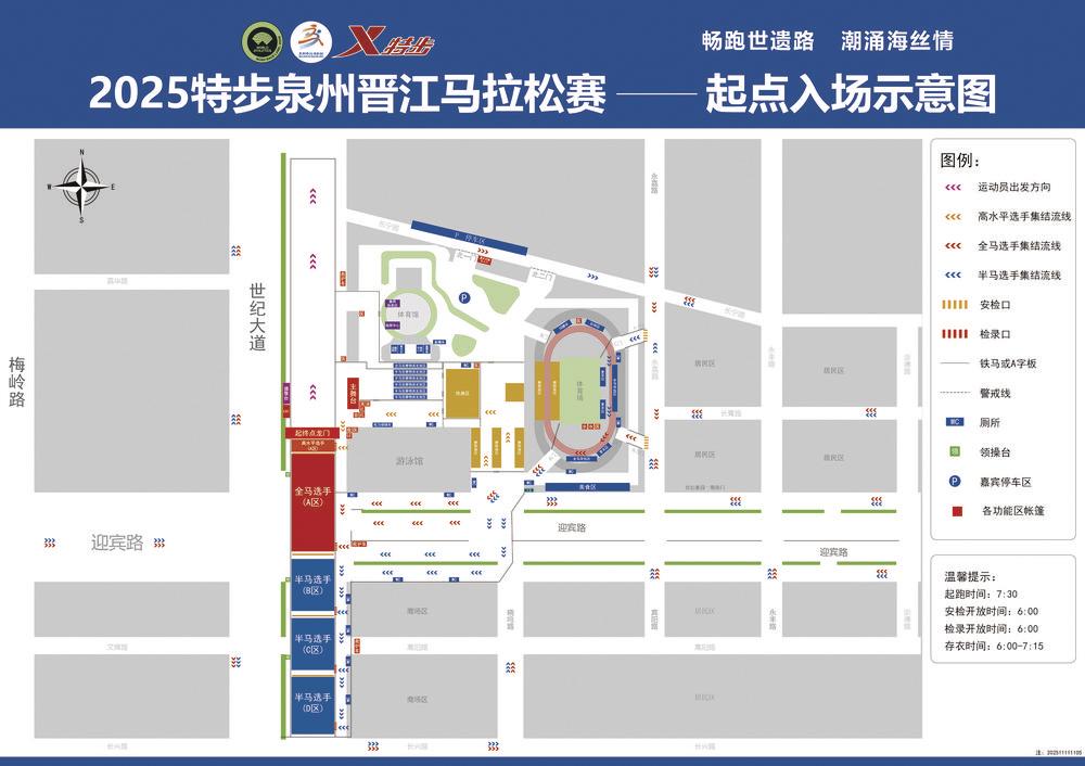12月7日7:30,2025特步泉州晋江马拉松赛将在晋江市体育中心鸣枪开跑。赛前存包地点、检录时段如何安排?赛后完赛包领取流程、配套服务有哪些?这份参赛指南,助力每位跑友一路畅通、顺利完赛。 晋江体育中心集结 上午6:00开始检录 晋江市体育中心是本次比赛的主会场,所有参赛选手均从这里出发。比赛当日6:30起相关路段将实施交通管制,建议选手合理规划出行时间与方式,提前抵达体育中心周边区域。 从抵达体育中心到进入集结区,选手需依次完成安检、存包、检录等关键环节。 安检开放时间为6:00至7:15,分别在永嘉路与迎宾路、长青路、长宁路交叉口设置安检口,选手可任选其一进行安检。安检通过后,马拉松选手从体育中心D门进入体育场,半程马拉松选手从C门进入。 体育场内划分全马存包区、半马存包区,同步设置更衣区与公共厕所。存衣开放时间为6:00至7:15。选手需按对应号段寄存个人物品,贵重物品请自行妥善保管。存包完成后,所有选手统一从体育场A门退出,经南门前往检录候跑区。 需要提醒的是,每位选手都有一大一小两块号码布,大号码布需佩戴于胸前明显位置且正面朝外,未按规定佩戴、折叠或遮挡号码布的选手,组委会有权取消其比赛成绩;未佩戴号码布者将被拒绝参赛。小号码布需粘贴在存衣包上,作为存取包的凭证。 检录口位置有变化 一枪发令分区出发 检录开放时间为6:00至7:20,选手需在规定时段内前往对应项目检录区完成检录,跨区起跑将被取消成绩及名次。 今年赛事的检录口有所变化,全马、半马检录口均位于世纪大道。选手从体育场A门出经南门,前往世纪大道后,按所属分区(马拉松运动员A区、半程马拉松运动员B区/C区/D区)找到对应检录口。现场通过核查号码布、计时芯片、参赛手环完成检录,合格者方可进入候跑区。 作为世界田联标牌赛事,本届晋马吸引了各路高手参加。根据规定,经组委会认定的高水平运动员必须在规定时间内指定检录区(S区)进行单独检录。未参加检录的,其成绩将不作为官方比赛成绩。 比赛采取一枪发令同时起跑的办法,起跑顺序按马拉松高水平运动员(S区)、马拉松运动员(A区)、半程马拉松运动员(B区/C区/D区)依次排列,各方阵间距20米。 一切准备就绪后,本届晋马将于7:30准时开跑。比赛发令20分钟后,不再允许选手进入赛道起跑。 赛后可以拉伸泡脚 还可享用面线糊牛肉羹 全马、半马项目终点均设在晋江市体育中心,其中半马关门时间为10:45,全马关门时间为13:45。 选手抵达终点、顺利完赛后,经主舞台直行一段距离后根据指示牌右转进入体育中心,在祖昌体育馆台阶空地前,按参赛项目领取完赛奖牌与完赛包。 随后,选手可沿现场指示牌从体育场A门返回场内,出示本人号码布取回寄存物品。半马取包截止时间为11:30,全马取包截止时间为14:30。如未能按时领回个人物品,请于赛后5个工作日内到组委会办公室领取。 建议选手完赛后避免立即停留,主动进行肌肉放松。体育场内将设置赛后拉伸服务区,选手需按指引有序入场,人数较多时请自觉排队等候。此外,组委会还提供冰水泡脚服务,选手使用前需佩戴组委会发放的一次性脚套,使用后请将脚套就近投入垃圾桶。 备受好评的赛后美食区将再度亮相,地点位于体育中心篮球场。届时,现场将为完赛跑友免费供应热腾腾的牛肉羹、面线糊、花生汤、姜汤等特色美食。请大家有序用餐、文明用餐。(记者 李诗怡) |