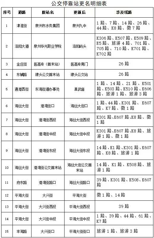 12月15日起,泉州公交将增设、调整、重命名部分公交站点。其中,7条线路增停8个已有中途站点,3条线路取消停靠单个中途站点,15个站点重新命名,1条线路调整首末班发车时间,3条线路重命名。小伙伴们,看看有你家附近有没有调整 01分线路拟新增、取消公交停靠站点 (一)22路(院前公交站-福厦铁路泉州站)在繁荣路增停“繁荣路中段”站。 (二)26路(医高专-见龙亭小区)在美仙路增停“美仙路中段”站。 (三)K308路(中骏世界城-清濛缺井村)在东辅路增停“埭头公交”站。 (四)302路(罗溪-松角山首末站)在县道332线增停“松角山村委会”站。 (五)K204路(中骏世界城-霞美镇政府)在安吉路增停“青莲寺”站。 (六)49路(文化宫-珑玥湾)在江滨南路往文化宫方向单侧增停“金鲤街口”站。 (七)泉州老年大学公交专线(泉州五中城东校区(泉州老年大学)-泉州老年大学旧校区(市老年活动中心))在丰泽街增停“人民医院”站、增停“公交大厦”站点。 (八)旅游3路(东宏路公交首末站-曾林村)在坪山路取消停靠“云谷山兜”站点。 (九)龙岭(东宏路公交首末站-曾林村)在坪山路取消停靠“云谷山兜”站点。 (十)11路(客运中心站-罗溪)在万虹路取消停靠“杏宅路口”站点。 02公交停靠站点名重新命名 经反复排查、实地走访后,拟对15个公交停靠站点重新命名。